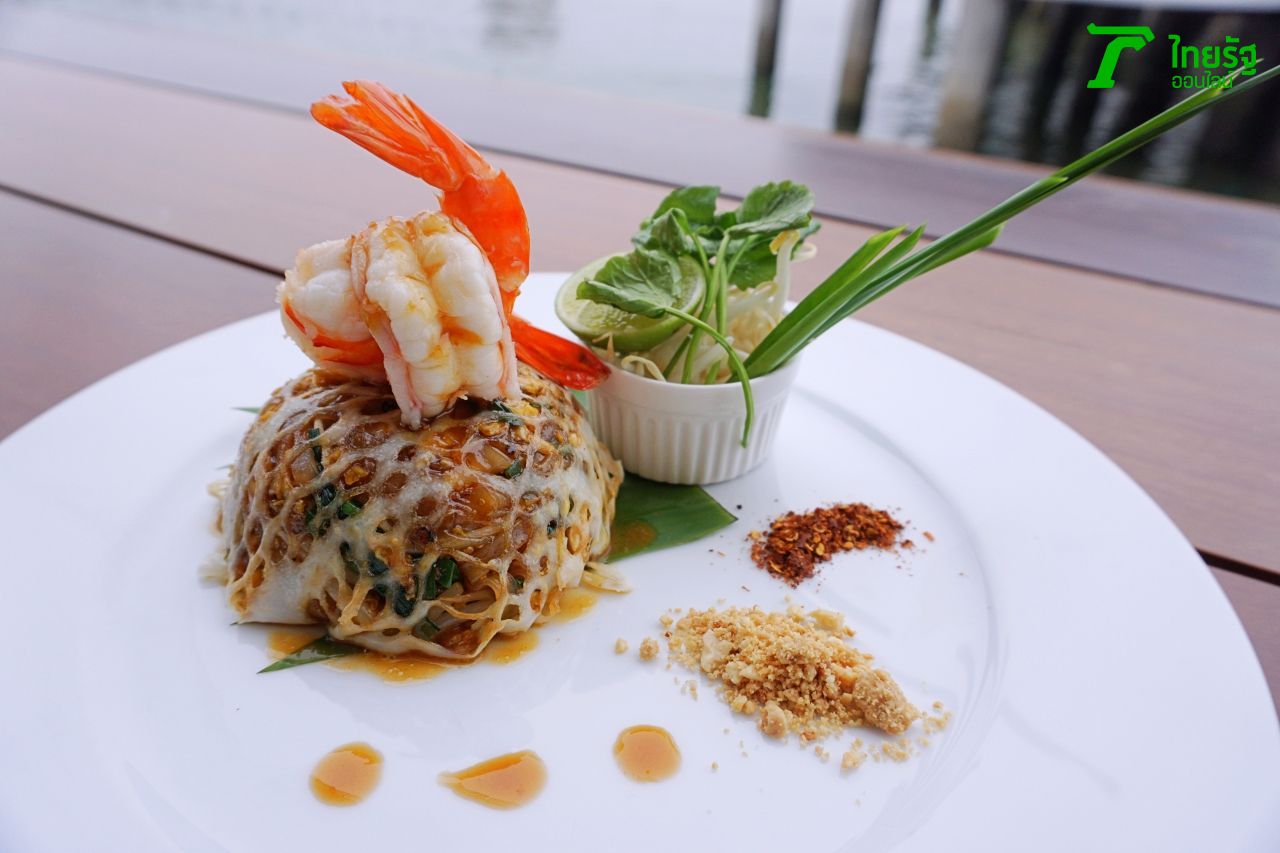 จานถัดมาเป็นเมนูสุดคลาสสิกของอาหารไทย นั่นคือ ผัดไทยห่อไข่ แต่เมนูนี้เชฟวินรังสรรค์ออกมาในหน้าตาที่แตกต่างไปจากเดิม คือ ใช้ไข่ขาวมาทอดเป็นแผ่นแบบตาราง แล้วเอามาห่อผัดไทยอย่างสวยงาม วางท็อปปิ้งด้านบนด้วยกุ้งใหญ่ให้มาถึง 2 ตัว จานนี้ชิมแล้วประทับใจอีกเหมือนกัน เพราะเส้นผัดไทยผัดมาได้อย่างเหนียวนุ่ม ซอสผัดไทยก็อร่อยลงตัว แถมกุ้งก็สดมาก เนื้อเด้งดึ๋ง กรอบ หวาน โอ๊ย...ฟิน