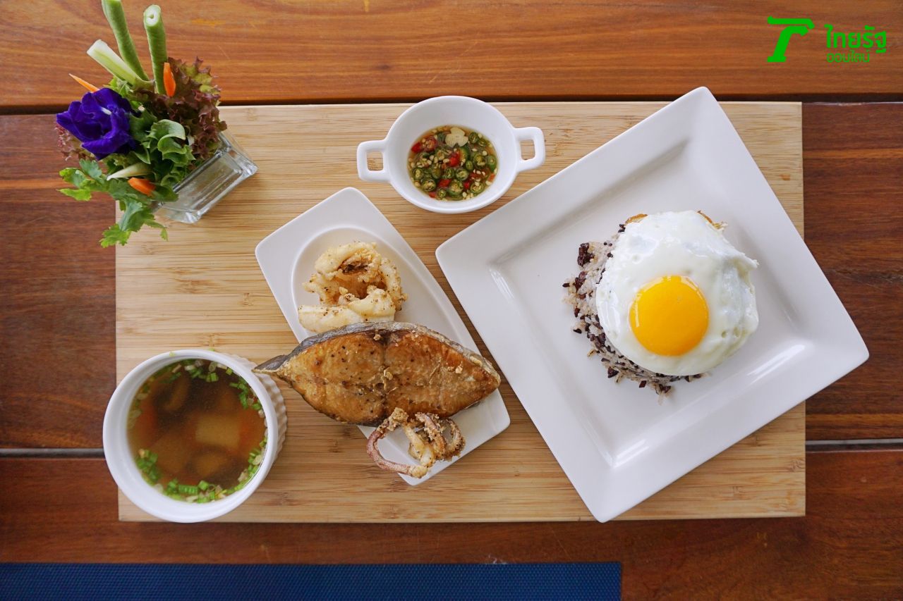 ข้าวหลากสีหุงสุก หอม นุ่ม นำมาผัดอย่างพิถีพิถัน ปรุงรสได้อร่อยพอเหมาะแบบไม่ต้องเติมพริกน้ำปลาให้เสียรส โปะด้านบนด้วยไข่ดาวสุกปานกลาง เคียงมาพร้อมกับหมึกแดดเดียวทอด สด กรอบ และปลาอินทรีทอดชิ้นใหญ่ไซส์จัมโบ้ และน้ำซุปหอมๆ สไตล์ญี่ปุ่น ทานแล้วเข้ากันดีมาก โดยเฉพาะตัวข้าวผัด เชฟผัดได้อร่อยมากจริงๆ คอนเฟิร์ม!