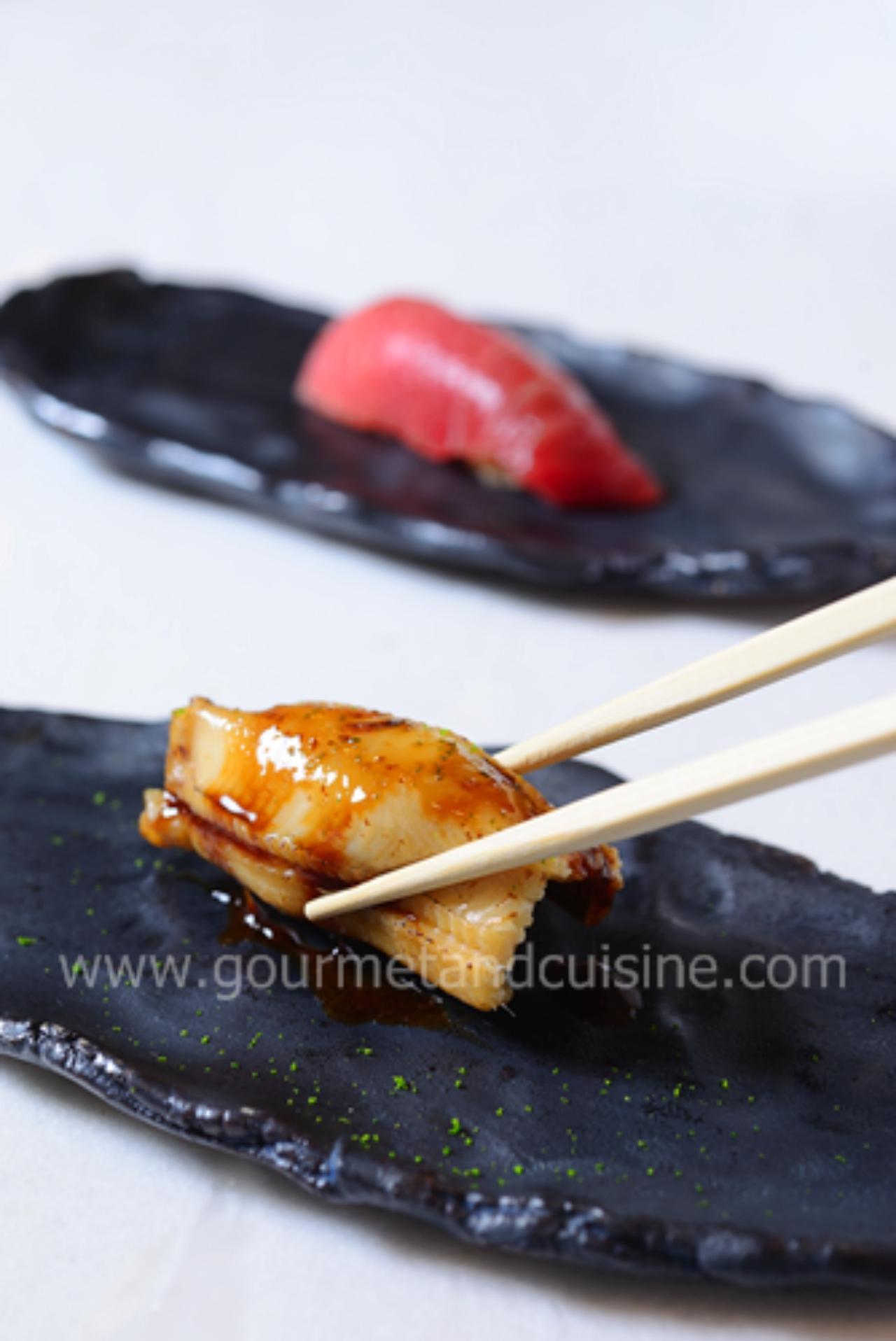 ต่อด้วย Akamitsuke บลูฟินทูน่าเอจจิงนาน 3 วัน เพื่อดึงรสชาติของปลาออกมา แล่เป็นชิ้นบางพอดีคำ แล้วหมักด้วยโชยุสูตรลับนาน 10 นาที เนื้อปลารสชาติกลมกล่อมเข้ากับมัสตาร์ดกลิ่นฉุนเล็กๆ ที่ทาอยู่บนหน้า