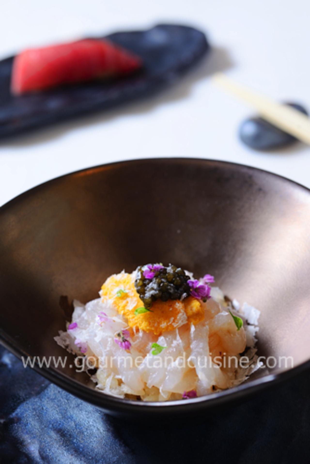 เชฟต้อนรับเราด้วย Shiro Ebi Donburi กุ้งขาวตัวเล็กสดและหวานจากโทยามะ วางบนข้าวญี่ปุ่น ท็อปด้วยฮาตาเตะอุนิ และคาเวียร์จากเยอรมนี ก่อนเสิร์ฟโรยเกลือแล้วตกแต่งด้วยดอกไม้เล็กๆ กินหมดแล้วยังทิ้งรสนวลเนียนอยู่ในปาก