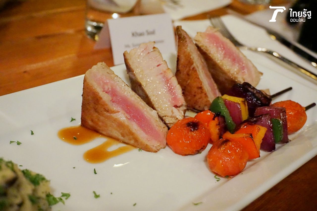 สเต็กทูน่าย่างมาแบบสุกพอดีๆ เนื้อข้างในยังอมชมพูอยู่นิดๆ ปรุงรสมาอร่อยกลมกล่อมมากๆ เสิร์ฟเคียงคู่มาด้วยมันบดรสชาติอร่อย และผักย่างเสียบไม้ เราชอบจานนี้มากเป็นพิเศษ