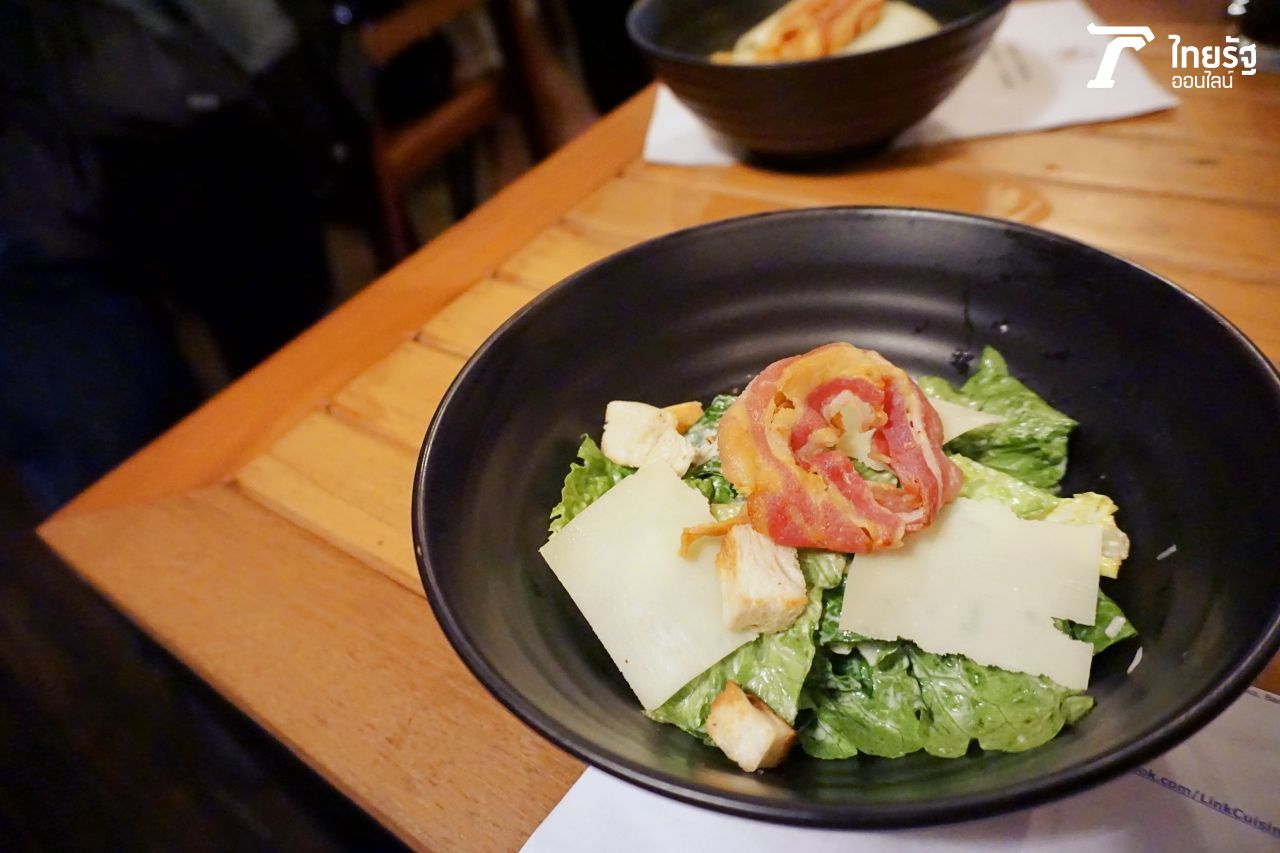 ต่อด้วยซีซ่าร์สลัดแบบอิตาเลียนแท้ๆ ผักกรอบสดคลุกมาในน้ำสลัดที่ปรุงมาอย่างดี อร่อยลงตัว ท็อปปิ้งมาด้วยเบคอนกรอบชิ้นใหญ่ แต่เราว่าเบคอนแอบเค็มไปนิดนึง จานนี้โดยรวมถือว่าดี