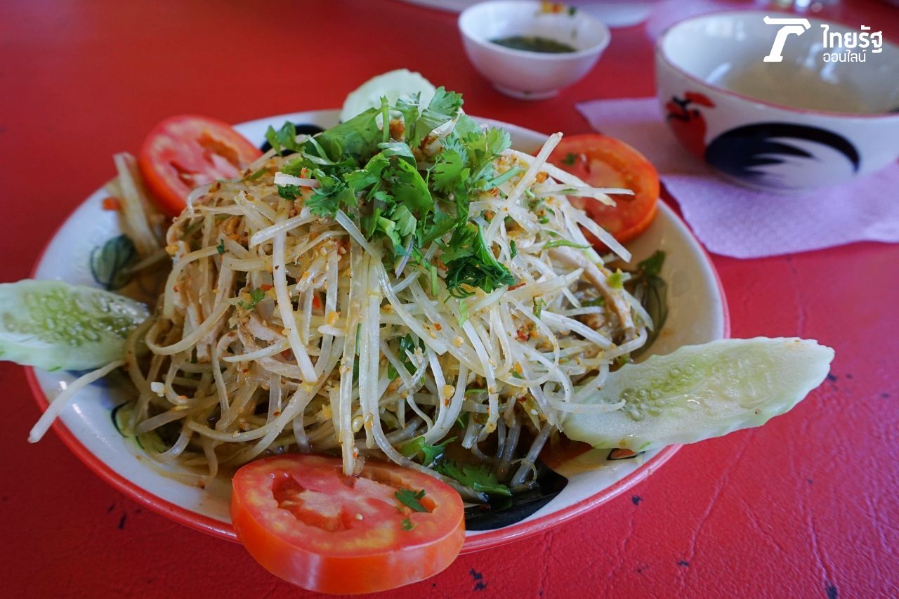 ถัดมาเป็นเมนูแปลกที่เราเพิ่งเคยทานเป็นครั้งแรก ดูหน้าตาไม่ค่อยน่าทาน แต่พอชิมเข้าไปคำแรก เฮ้ย...อร่อย! เมนูนี้ทำจากเส้นมะละกอดิบ ขูดเป็นเส้นกรอบๆ นำมาปรุงกับน้ำยำรสเปรี้ยวหวานเผ็ด เผ็ดไม่มาก เด็กก็ทานได้ ผสมคลุกเคล้าด้วยถั่วลิสงคั่ว งาขาวคั่ว หมูยอหั่นเส้นๆ และน้ำมันงาหอมกรุ่น ทานเพลินได้เรื่อยๆ ส่วนตัวรู้สึกว่าเหมือนอาหารเวียดนามหน่อยๆ