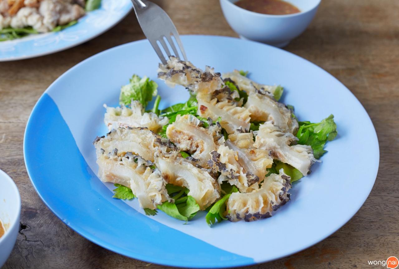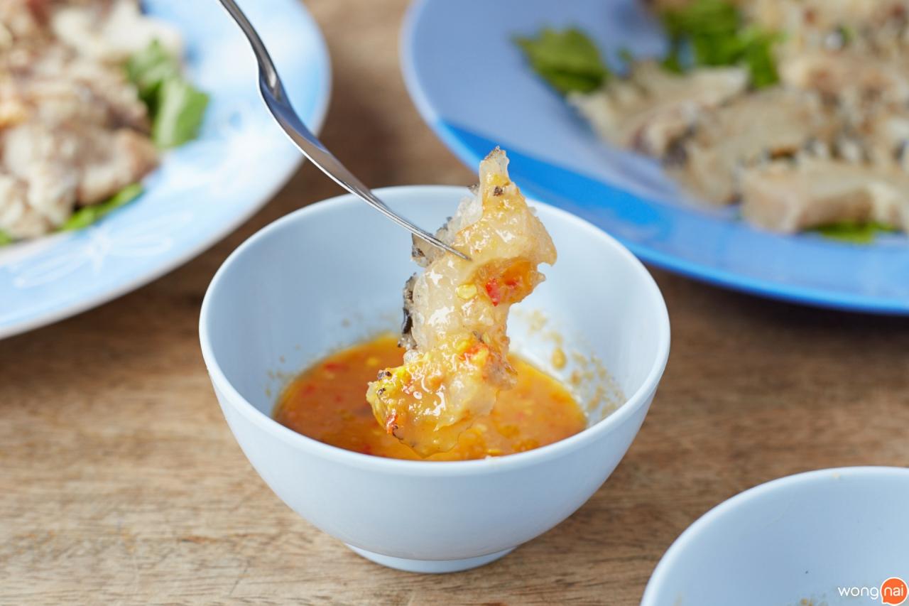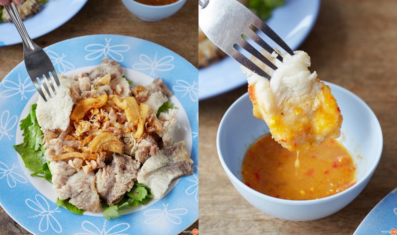 หนึ่งในเมนูไฮไลต์ของทางร้าน นั่นคือ ปลาหมอทะเลลวกจิ้ม 200 บาท หาทานยากอีกเช่นกัน เนื้อปลาหมอทะเลลวกโรยด้วยกระเทียมเจียวและหนังหมูเจียวเสิร์ฟบนผักขึ้นฉ่าย ทานคู่กับน้ำจิ้มซีฟู้ดสูตรของทางร้าน รสชาติแซ่บซี้ดเปรี้ยวเผ็ดถึงใจ