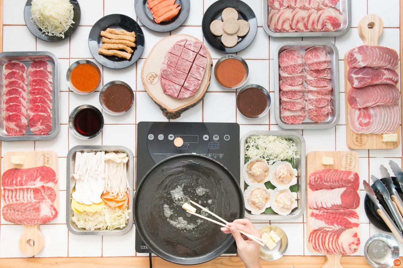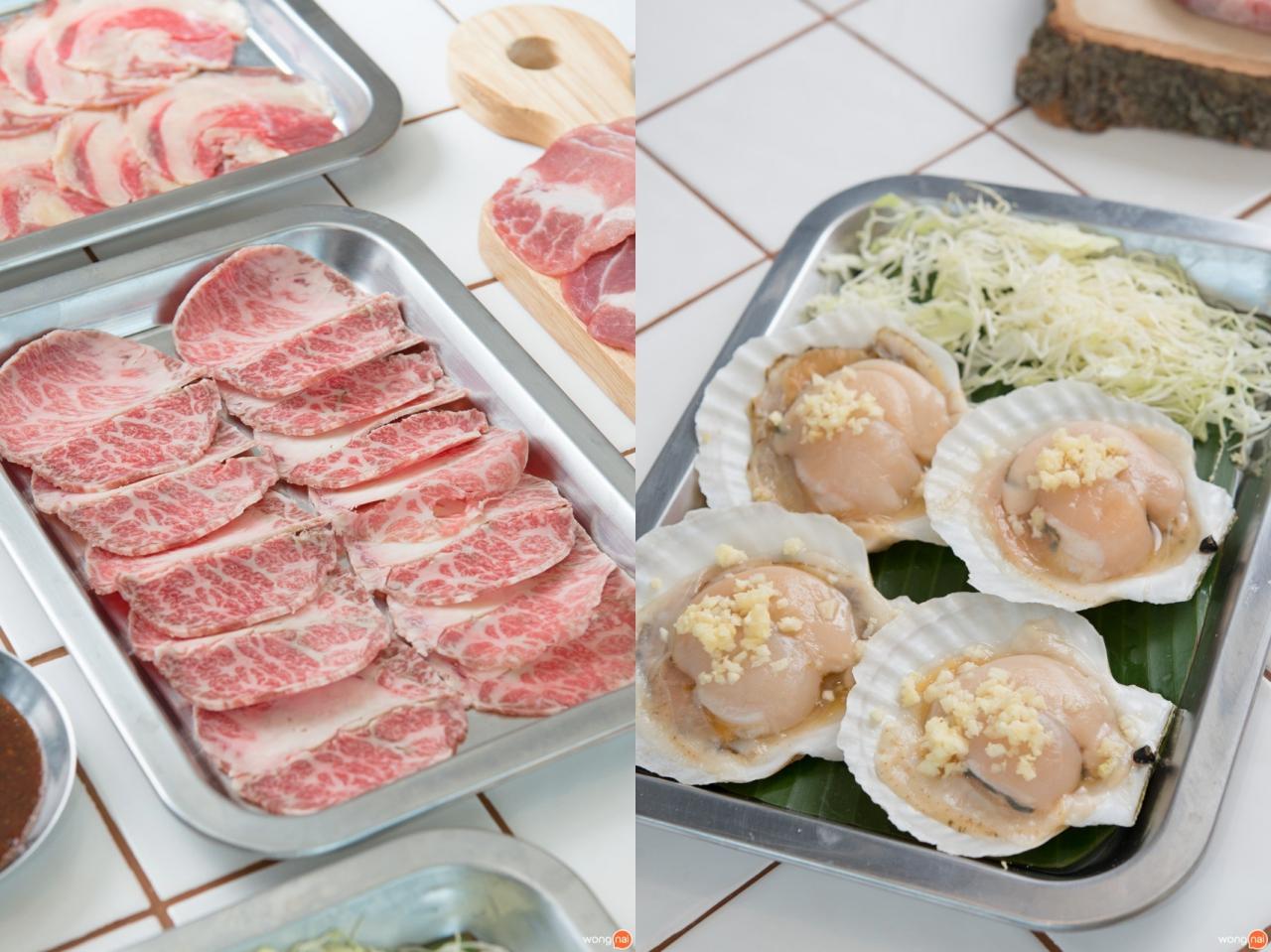ส่วนใครที่ไม่ทานเนื้อก็ไม่ต้องน้อยใจไปนะคะ เพราะที่ร้านยังมี สันคอหมู, หมูสามชั้น, สันในหมู, สะโพกหมู, กุ้ง, ปลาหมึก หอยเชลล์ และของทานเล่นอีกมากมายเลยค่ะ