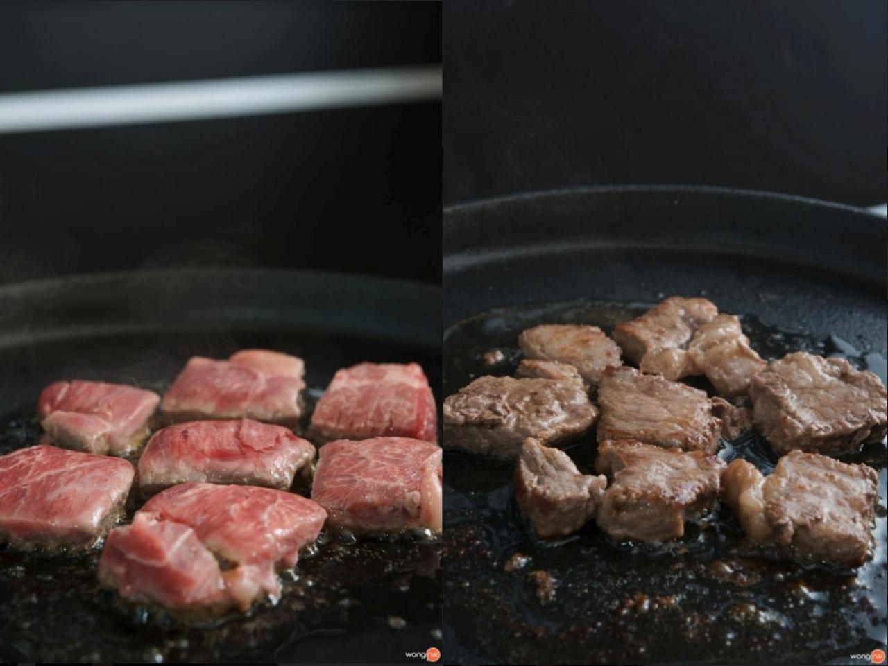 ลายไขมันสวยงาม เห็นแล้วตกหลุมรักกันเลยทีเดียว สันนอก 425 บาท เมื่อเทียบกับเกรดเนื้อวากิวจะอยู่ที่ระดับ A2-A3 เลยค่ะ ชิ้นหนาๆ หั่นลูกเต๋ามาเเบบพอดีคำ สันไหล่ 155 บาท มีไขมันที่มาจากสารอาหารวัว แทรกในเนื้อ นุ่มละมุนลิ้นมากๆ