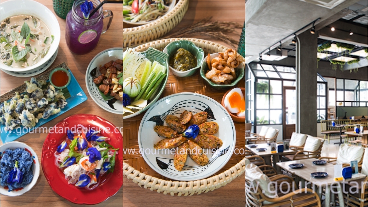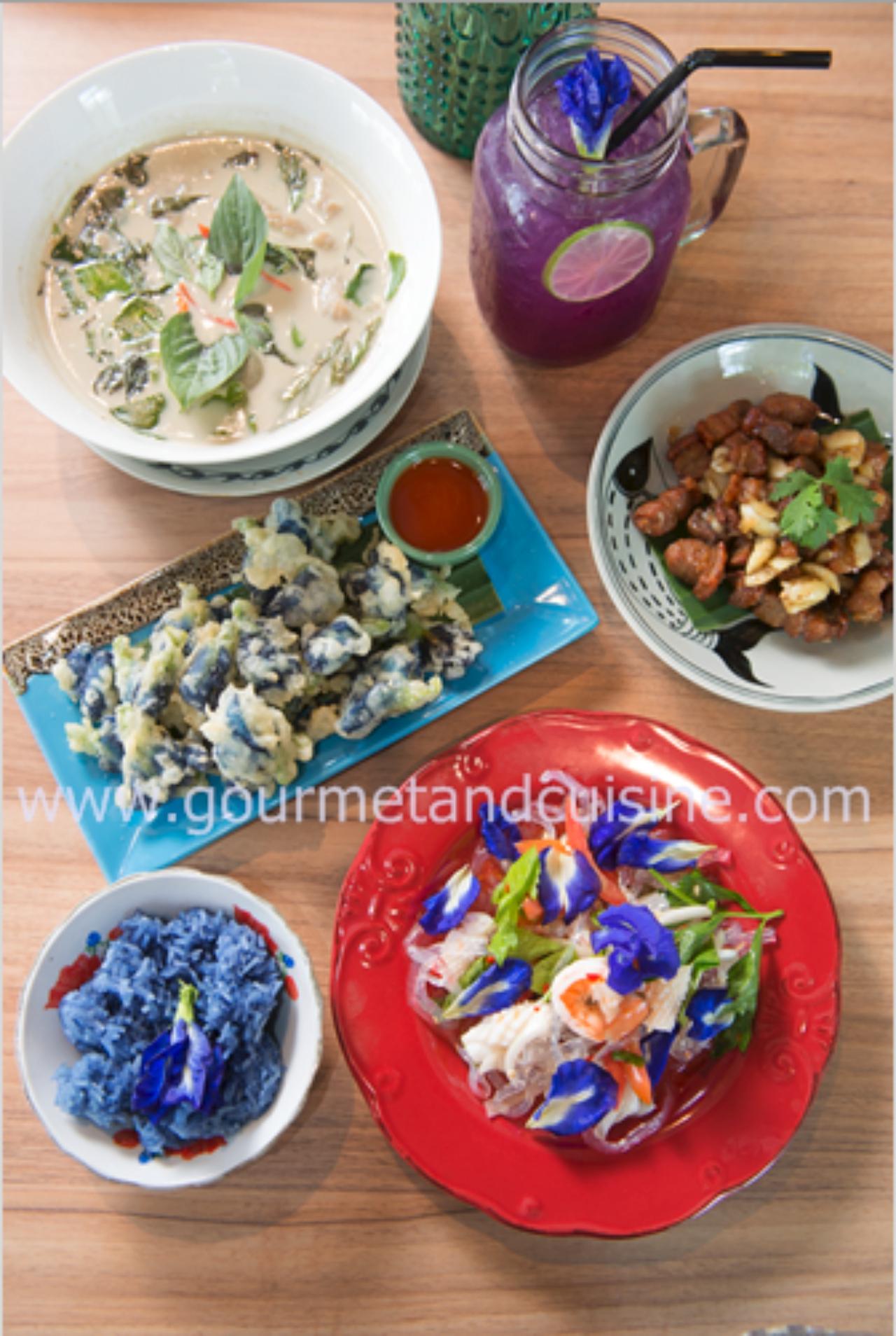 ก่อนจบมื้ออาหารเราอยากแนะนำเมนูจากดอกอัญชันอีกสักหน่อย ใครที่เป็นอัญชันเลิฟเวอร์ (เมนูยอดฮิตปี 2017) ที่นี่ก็เด่นไม่เป็นรองใคร เพราะใช้อัญชันที่ปลูกเองหลังบ้านดอกใหญ่มาทำอาหาร เช่น 'อัญชันคลุกเกลือ' เลือกเฉพาะดอกสีน้ำเงินดูสวยน่ากิน ชุบแป้งทอดกรอบ โรยเกลือนิดหน่อย จิ้มกินกับซอสพริกอร่อยดี