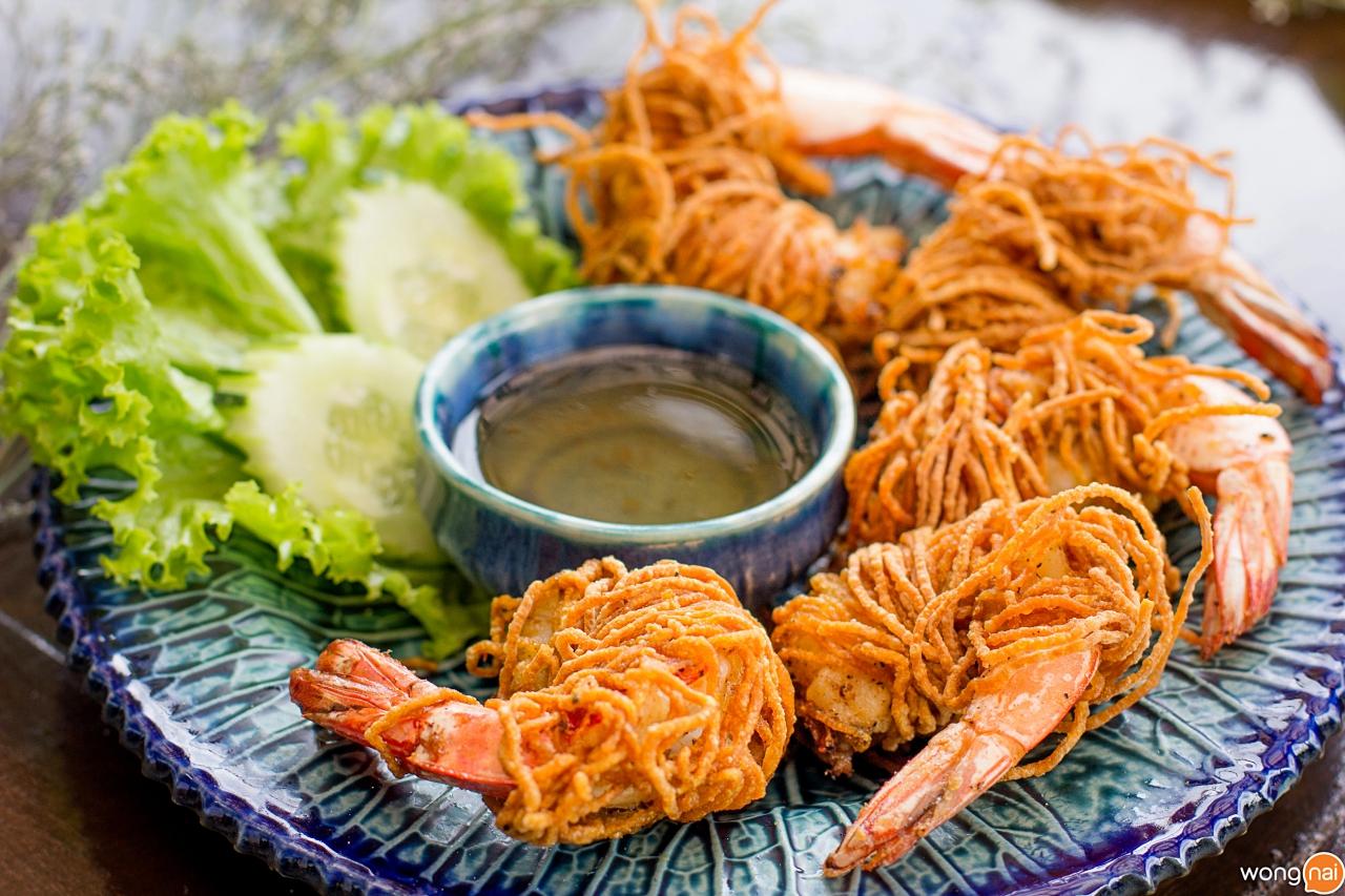 “กุ้งโสร่ง” 350 บาท เมนูครีเอตของทางร้าน เป็นกุ้งลายเสือคัดไซส์พันด้วยเส้นหมี่เหลือง ทอดมาจนกรอบได้ที่ ลักษณะเหมือนกุ้งนุ่งโสร่งนี่เองค่ะ น่ารักเชียวล่ะ จิ้มกับน้ำจิ้มบ๊วย ได้รสสัมผัสของกุ้งเต็มๆ คำ