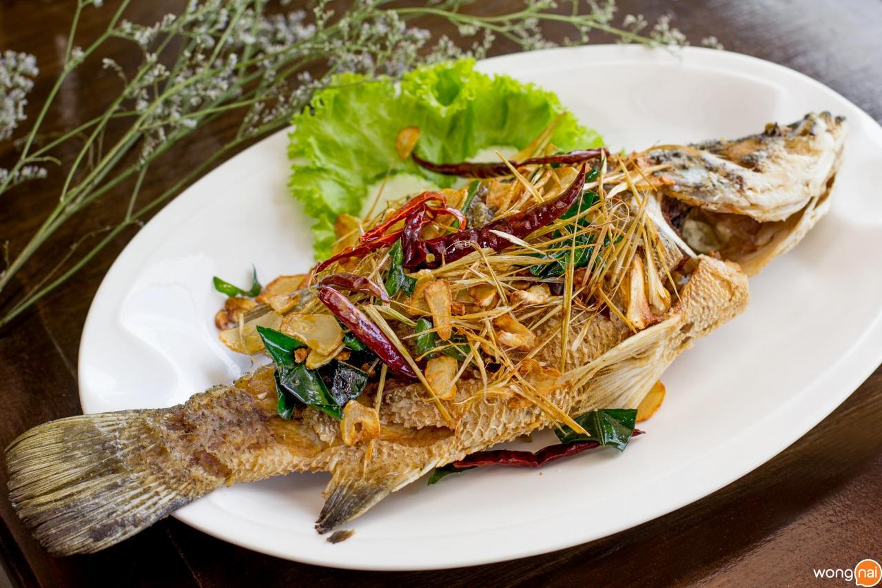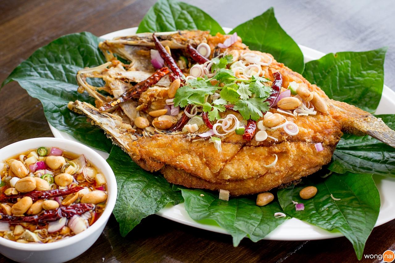 “เมี่ยงปลากะพง” 350 บาท ทางร้านคัดไซส์ปลากะพงขนาดกำลังดีค่ะ ผ่ากลาง นำลงทอดให้เหลือง กรอบนอกนุ่มใน ทานคู่กับน้ำยำเครื่องเมี่ยง และใบชะพลูหอมๆ ถัดมาเป็นเมนู "ปลากะพงทอดสมุนไพร" ทอดปลามาดีมาก กรอบนอกนุ่มใน หอมเครื่องสมุนไพรขึ้นจมูก อร่อยดีอีกจาน