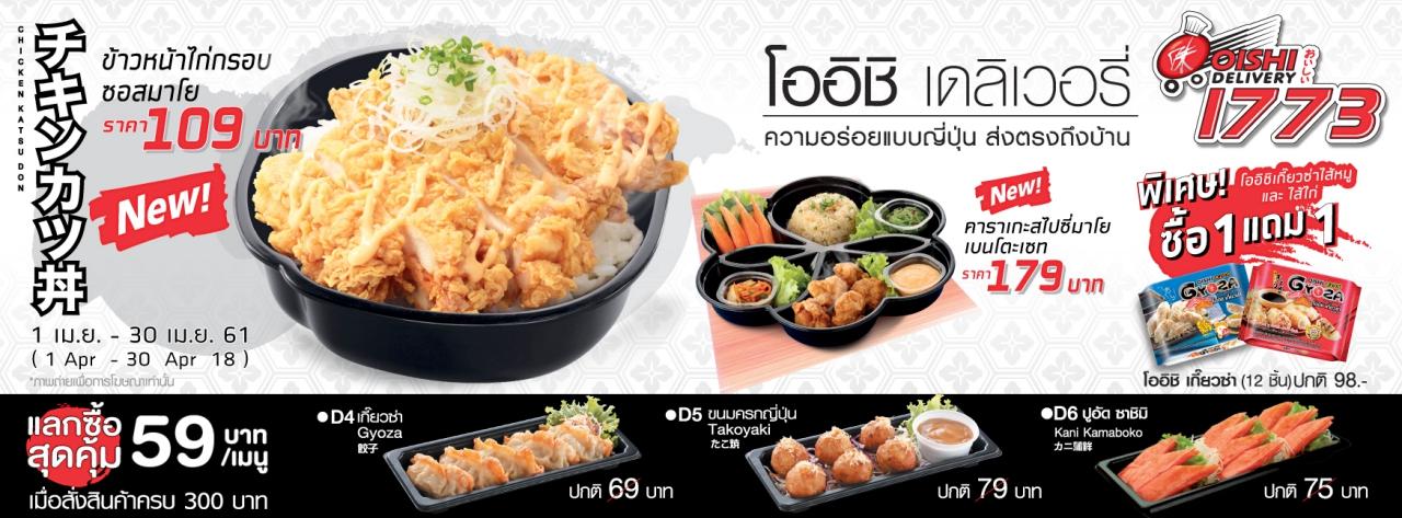โออิชิ เดลิเวอรี่ ความอร่อยแบบญี่ปุ่นส่งตรงถึงบ้าน โทร.1773 ให้บริการอาหารญี่ปุ่นตามต้นตำรับ คงไว้ซึ่งคุณค่าทางโภชนาการที่ถือว่าเป็นสุดยอดทีเด็ด คือ เบนโตะ (ข้าวกล่องญี่ปุ่น) มีหลากหลายเมนูให้เลือกสรร โปรโมชั่นสำหรับช่วงสงกรานต์นี้ ตั้งแต่วันนี้ - 30 เมษายน 2561 ได้แก่