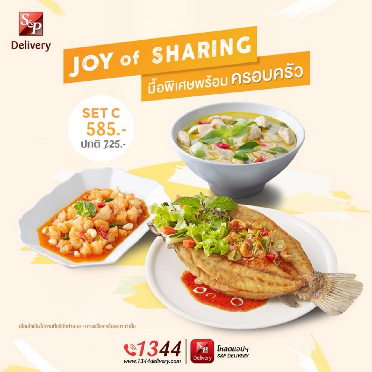 เมนู Joy of Sharing Set C ราคา 585 บาท (จากปกติ 725 บาท) ประกอบด้วย เมนูปลากะพงทอด 1 ที่, แกงเขียวหวาน 1 ที่ และกุ้งผัดพริกขี้หนู 1 ที่