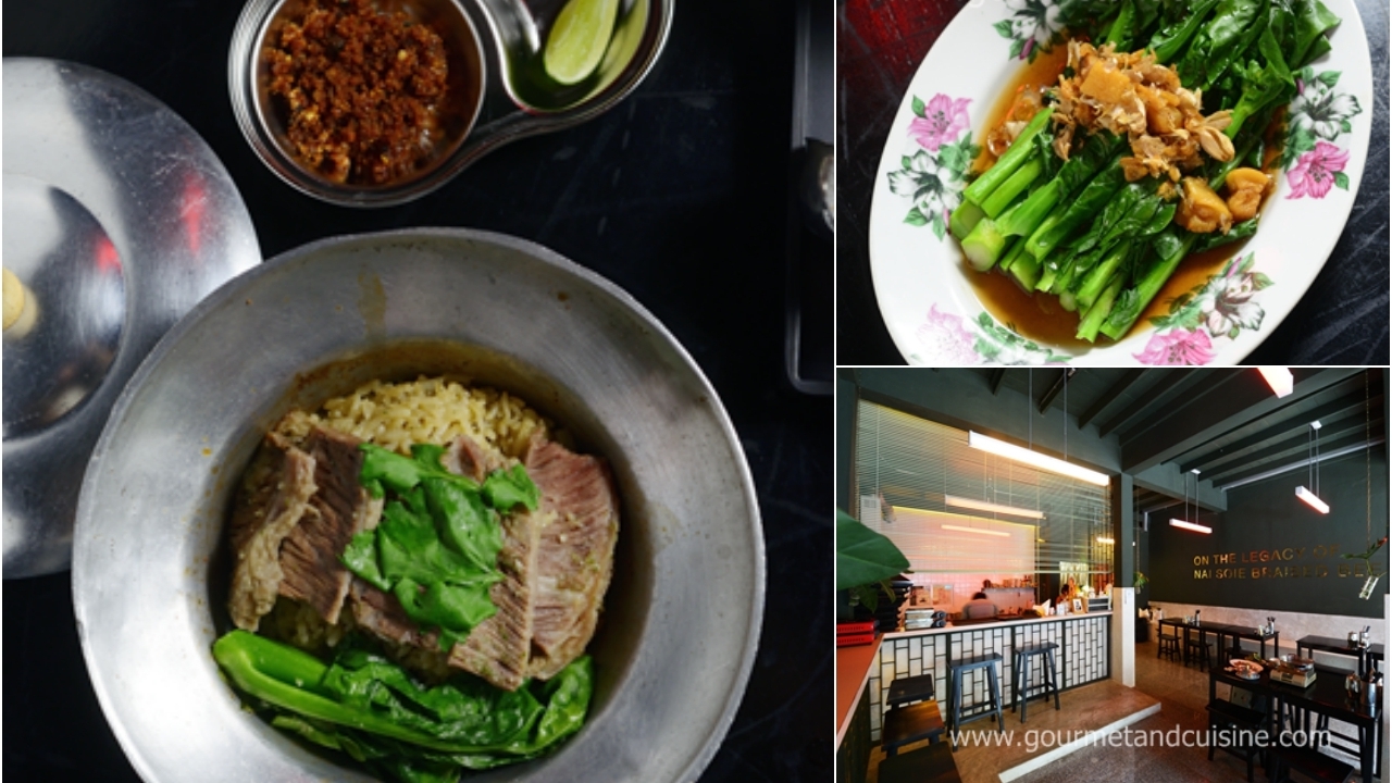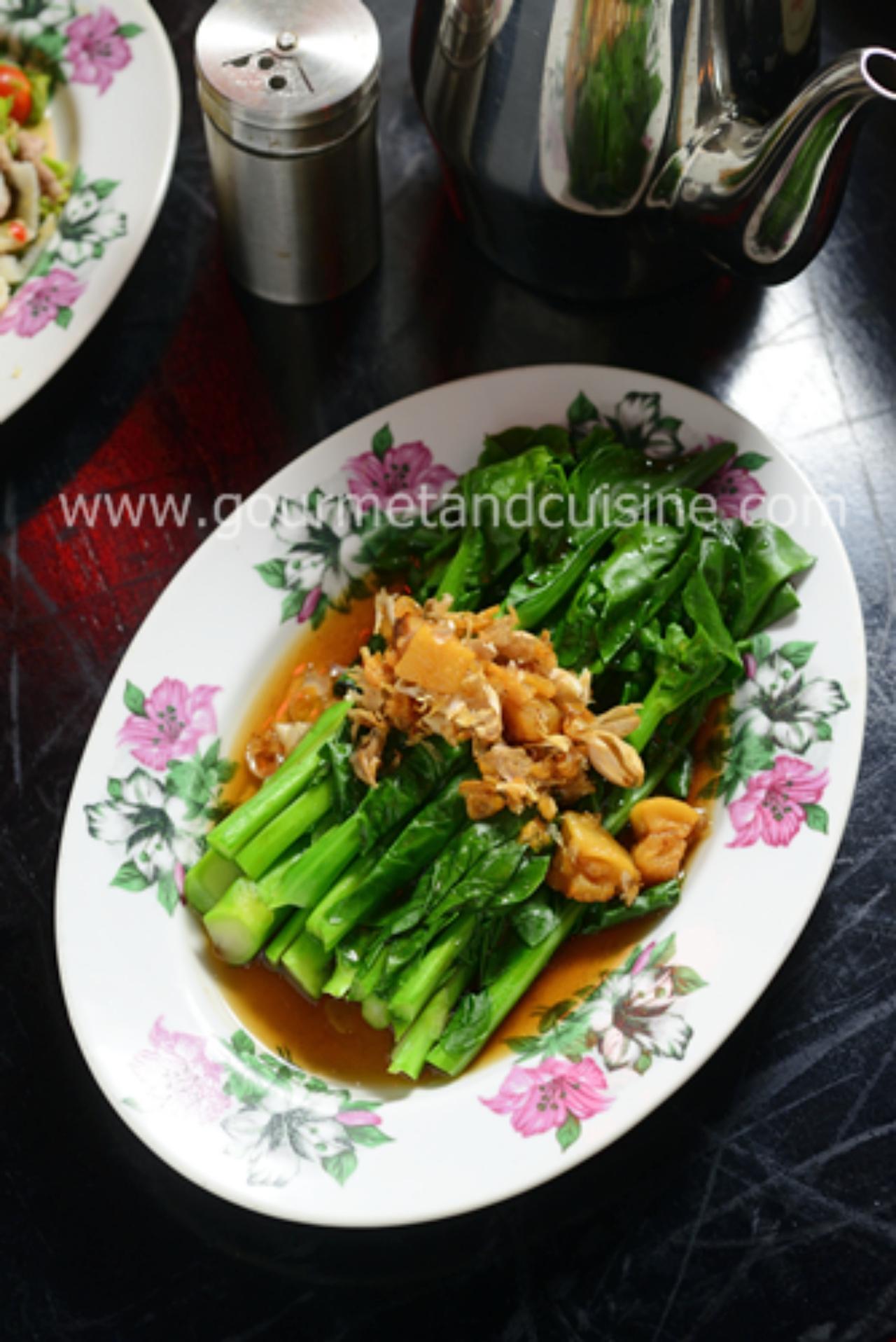 แต่ถ้าเริ่มอยากตัดรสชาติหนักๆ ของเนื้อลองสั่ง คะน้าน้ำมันหอย ที่เปลี่ยนจากราดน้ำมันหอยแบบฮ่องกง เป็นการลวกแล้วราดด้วยซอสสูตรพิเศษทำจากน้ำซุปหมูและเนื้อ ซึ่งไม่เค็มจนเกินไป...โรยกากหมูกรุบกรอบมากินด้วยกันก็เข้าที