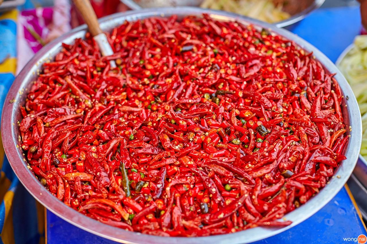 เมนูยำของร้านหลักๆ จะเป็นยำมะม่วงค่ะ เช่น ยำมะม่วงใส่ปูม้า, ยำมะม่วงปลากรอบ, ยำมะม่วงหอยนางรม ฯลฯ ราคาเริ่มต้นที่ 40 บาท เห็นพริกที่ใช้ยำถึงกับขนลุกเลยค่ะ เพราะแดงเถือกเอาเรื่องมากๆ เจ๊แดงบอกว่าเป็นพริกที่ผสมกับน้ำตาลปี๊บและน้ำอ้อย จะออกหวานๆ เผ็ดๆ โดยสูตรนี้เจ๊แดงก็คิดค้นเองด้วย