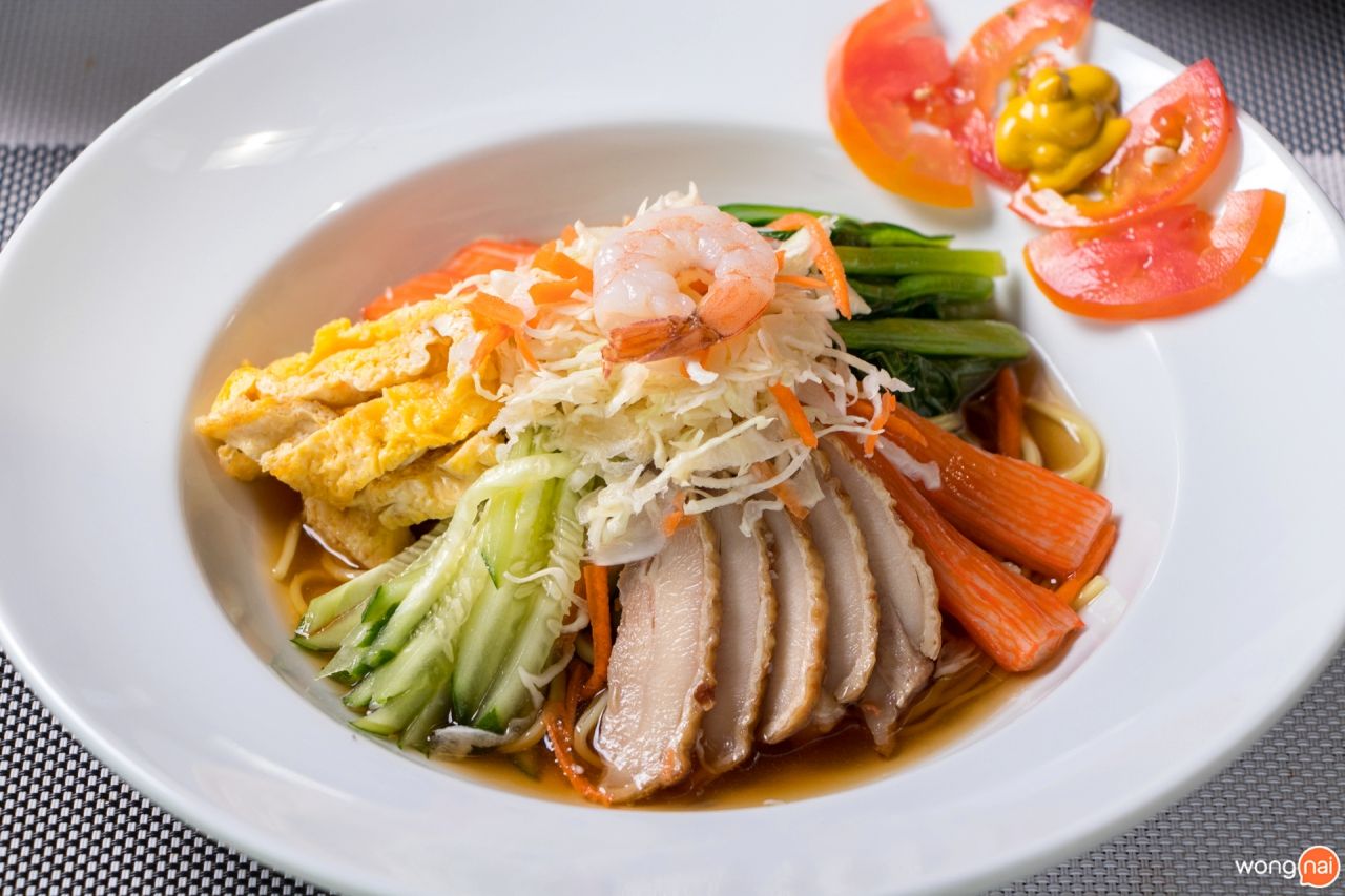 แต่ถ้าใครไม่ชอบทานซุปร้อนๆ ก็มี ราเม็งเย็น (65 บาท) มาทดแทนได้ แถมอร่อยไม่แพ้กัน เส้นราเมนเหนียวนุ่ม ราดด้วยน้ำซอสรสเปรี้ยวอมหวาน เสิร์ฟพร้อมเครื่องแบบอลังการจัดเต็มทั้งปูอัด, เนื้อไก่, ไข่, กุ้ง และ ผัก