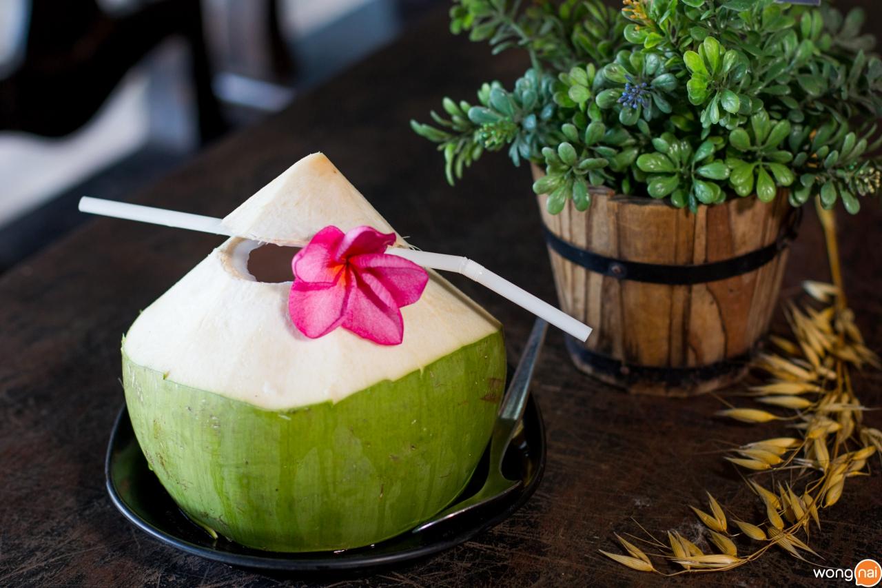 มาถึงที่ร้านแล้ว ระหว่างรออาหารก็สั่งน้ำมะพร้าวสดเย็นชื่นใจมากินกันก่อนเลย เนื้อมะพร้าวอ่อนมาก หอมสดชื่นค่ะ สามารถเลือกสั่งได้ทั้งน้ำมะพร้าว น้ำผลไม้ปั่น และยังมีบริการเครื่องดื่มอีกหลากหลายเลยค่ะ