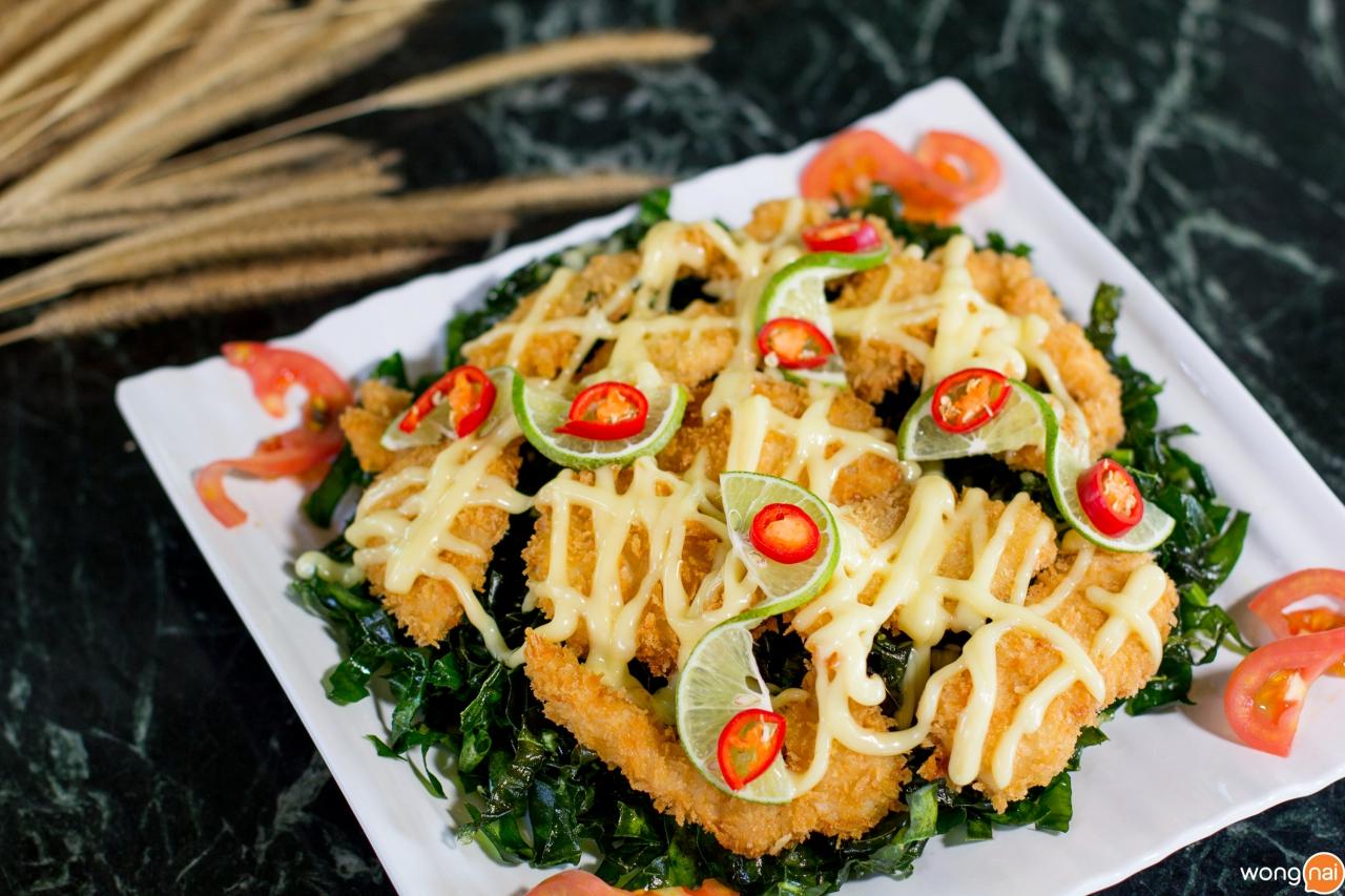 ไก่ครีมมะนาวทอดมาร้อนๆ เนื้อไก่กรอบนอกนุ่มใน เสิร์ฟมากับใบคะน้าทอดกรอบๆ ทีเด็ดอยู่ที่ซอสครีมมะนาว รสชาติเปรี้ยวๆ หวานๆ หอมกลิ่นมะนาว