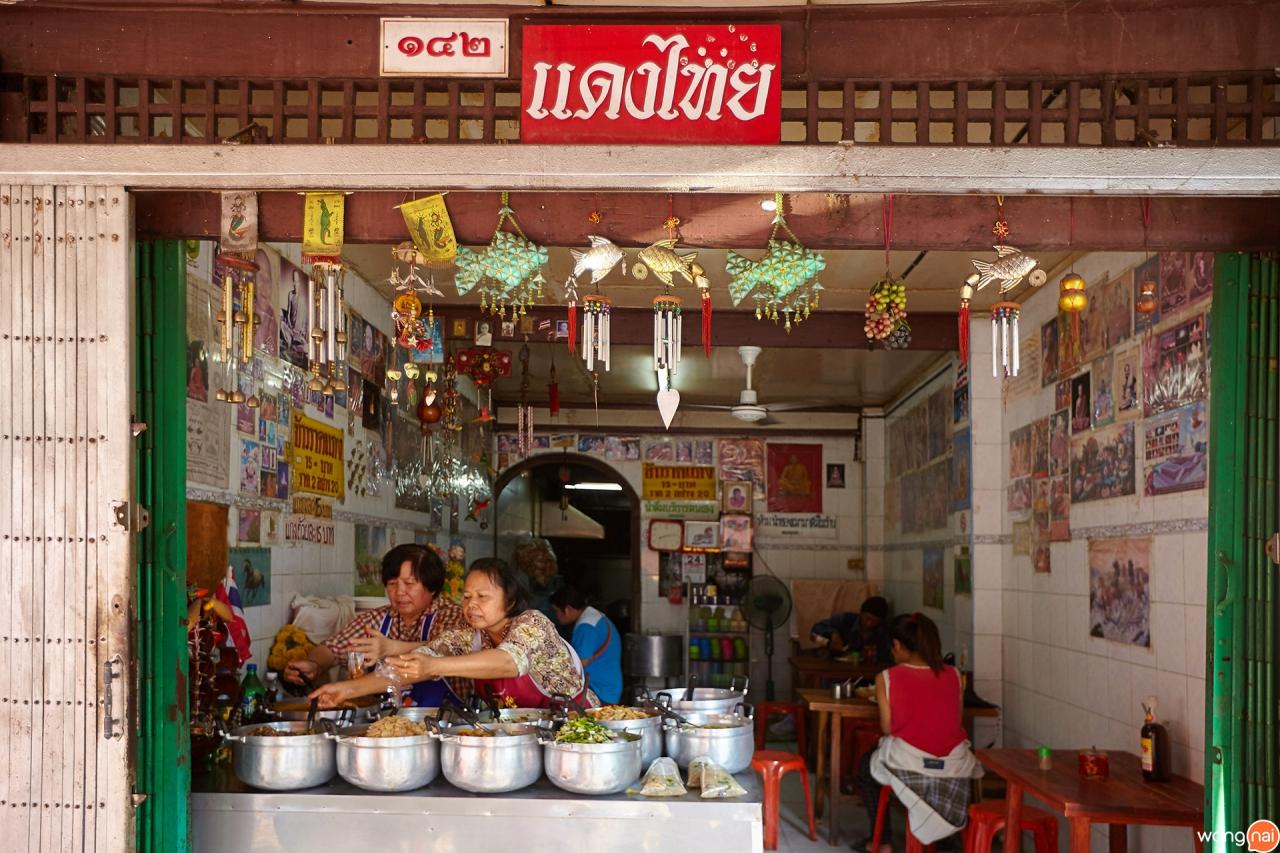 ร้านแดงไทย เป็นร้านข้าวราดแกงเก่าแก่ที่ขายมาตั้งแต่ปี พ.ศ. 2508 นานขนาดไหนก็บวกลบกันเอาเอง เพราะดูจากบรรยากาศของร้าน เชื่อแล้วว่าเก่าจริง ร้านเป็นห้องแถวเล็กๆ อยู่หน้าวัดหนองบัวรอง ต.ในเมือง อ.เมือง จ.นครราชสีมา เวลาขายไม่แน่นอนนะ วันที่เราไป 7 โมงเช้าก็เปิดแล้ว ประมาณเที่ยงๆ ถ้ากับข้าวหมดก็ปิดค่ะ ทั้งผู้ใช้แรงงานและคนในละแวกนั้นติดกันตรึม ต้องมากินทุกวันจนยกนิ้วให้