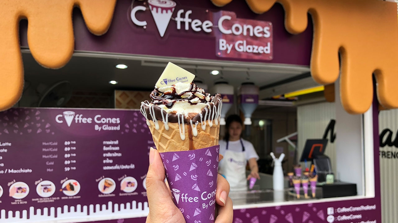 ในชื่อร้าน Coffee Cone by Glazed ที่ลูกค้าสามารถเลือกได้ทั้งกาแฟ ชาเขียว ชาไทย หรือโกโก้ก็มี ในโคนที่เคลือบช็อกโกแลตไว้ด้านใน บีบวิปครีมหรือเลือกฟองนมก็ได้ แถมยังมีซอสให้เลือกอีก 3 รสชาติ ได้แก่ ช็อกโกแลต สตรอเบอร์รี่ และคาราเมล