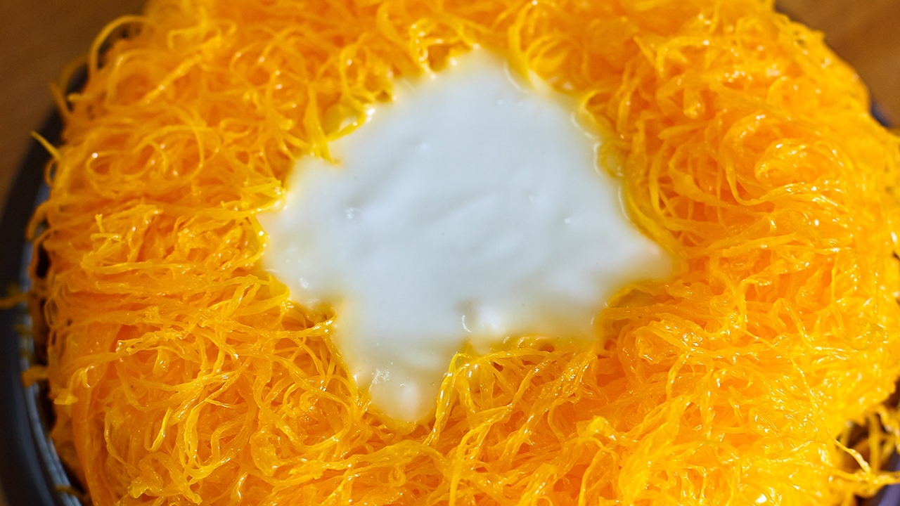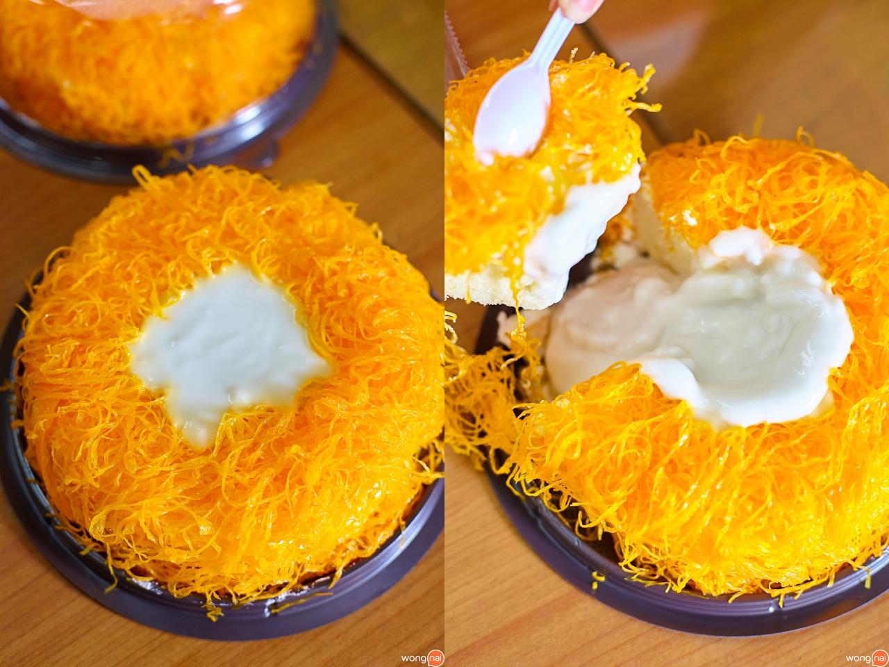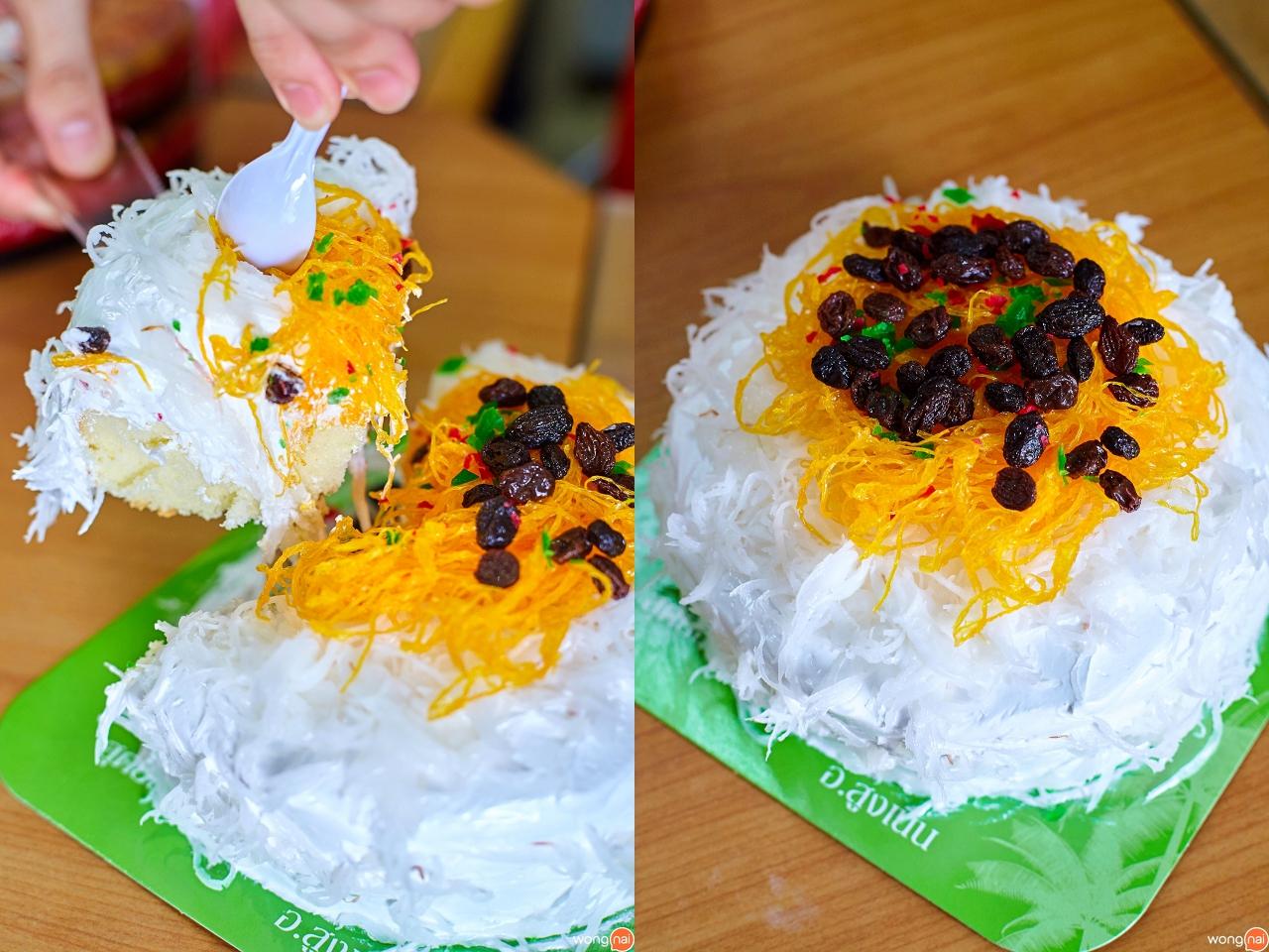กินเยอะๆ ก็ไม่ต้องกลัวอ้วนไป เพราะเป็นครีม low fat รสชาติไม่หวานมาก ข้างบนตัวเค้กมีมะพร้าวอ่อน ยังไม่หมดแค่นี้ เพิ่มความฟินเต็มพิกัดด้วยฝอยทองเข้าไปอีก กินแล้วระวังจะหยุดไม่ได้