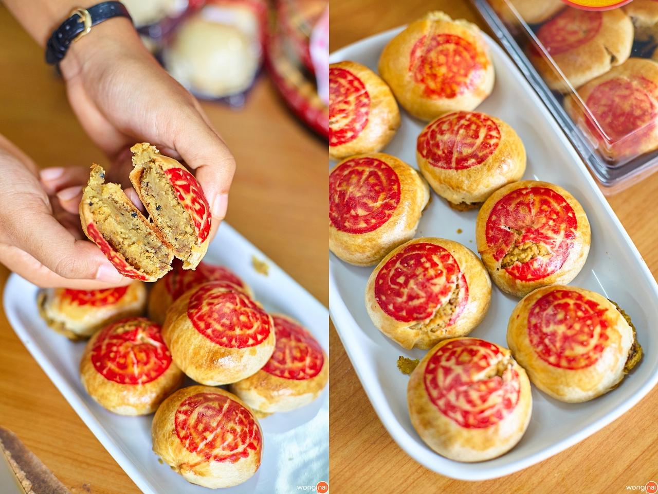 ขนมเปี๊ยะมีแต่ไส้เค็มเท่านั้นนะคะ เป็นถั่วผสมกับหมู จะออกมันๆ เค็มๆ แต่กลมกล่อม แป้งขนมเปี๊ยะบาง ไส้แน่น แน่นขนาดที่ไส้แตกออกมาจากขนมเลย