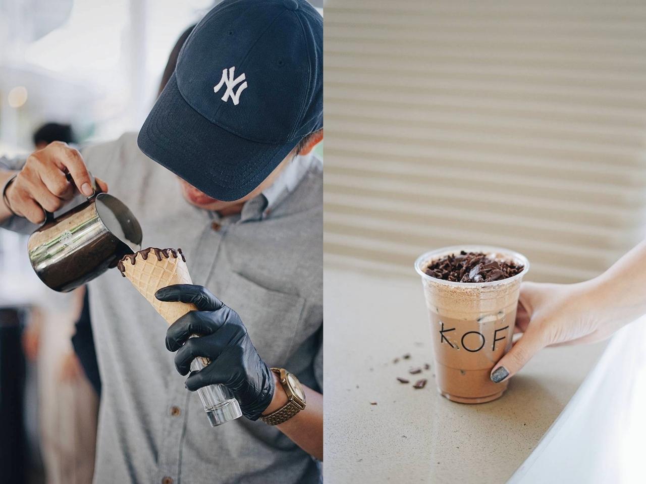 ร้านกาแฟสุดฮิปอย่าง “Kof” ได้มาเปิดสาขาสองใจกลางทองหล่อ โดยสาขานี้เป็นร้านแนวกลาสเฮาส์ ตั้งอยู่หน้า J-Avenue มีเมนูที่มีขายเฉพาะสาขานี้ ลองสั่ง Cocao Camo มาชิมค่อนข้างโอเคเลยนะ จิบได้เรื่อยๆ ส่วนเมนูซิกเนเจอร์ขายดีอย่างกาแฟโคนนั้นยังคงรสชาติเหมือนที่สาขาเดิมค่ะ ถ่ายรูปขึ้นกล้องด้วย และตัวสุดท้ายที่ลองคือ Marocchino คือกาแฟคล้าย Mocha แต่เอาไปเช็ก ตบท้ายด้วยการโรยด้วยช็อกโกแลตด้านบน น่ากินสุดๆ