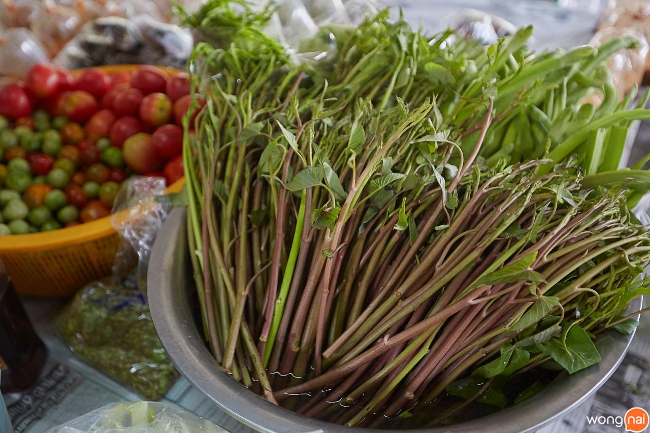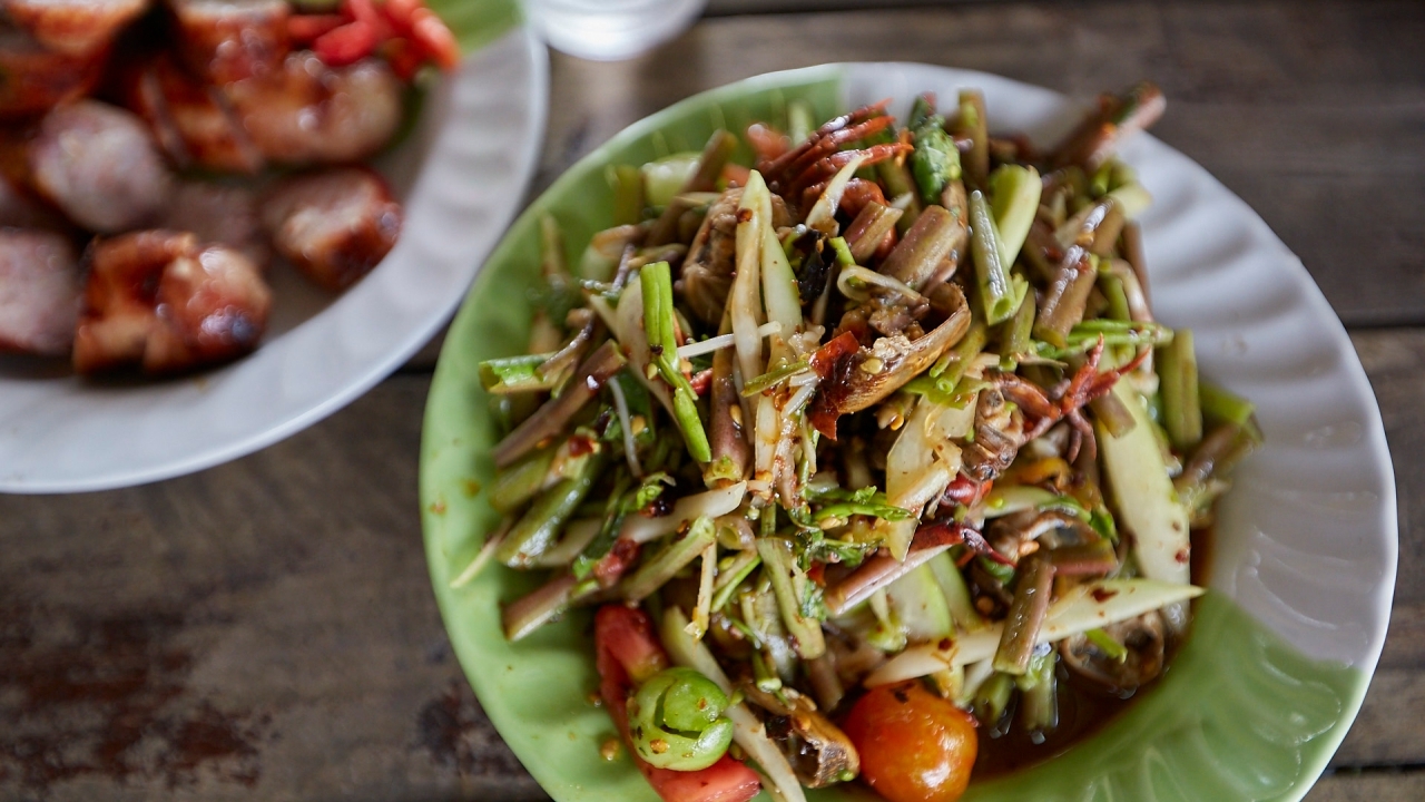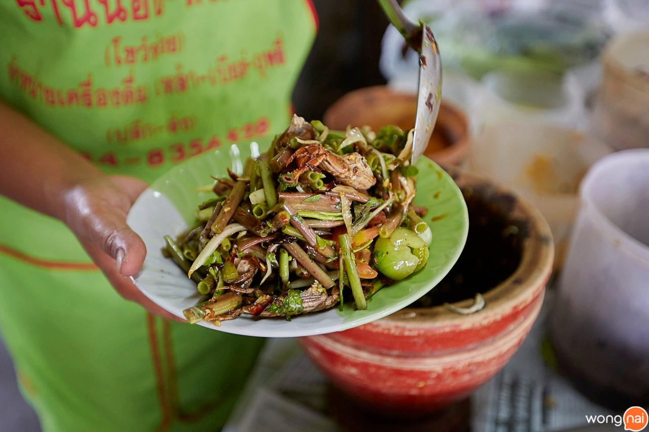 ระหว่างรอก็เลยให้ยายแจ๋วจัดส้มตำแซ่บๆ มากินฆ่าเวลาหน่อย ยายแจ๋วเลยทำส้มตำผักบุ้งมาให้ลอง ปกติร้านส้มตำที่เราเคยกินทั่วไปจะใส่ปูดองมา 2-3 ตัว แต่เจอร้านนี้เข้าไป จ้วงปูดองจากโหลเป็นทัพพี สะใจคนชอบแทะปูดองมาก ผักบุ้งก็กรุบกรอบดี กินแรกๆ รู้สึกหวานหอม เพราะใช้พริกคั่วตำ หลังจากกินไปสักพักมันก็ร้อนขึ้นเรื่อยๆ จนต้องหาน้ำวางไว้ข้างตัว