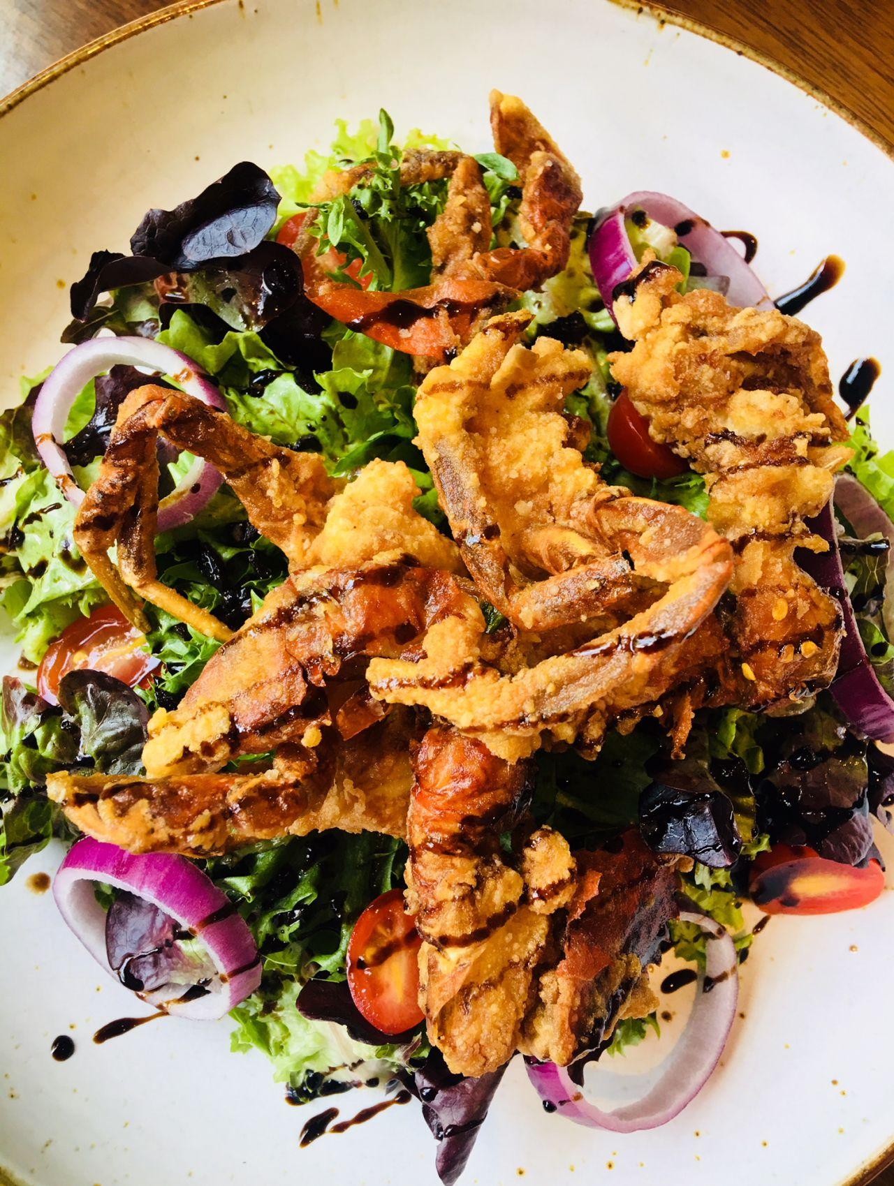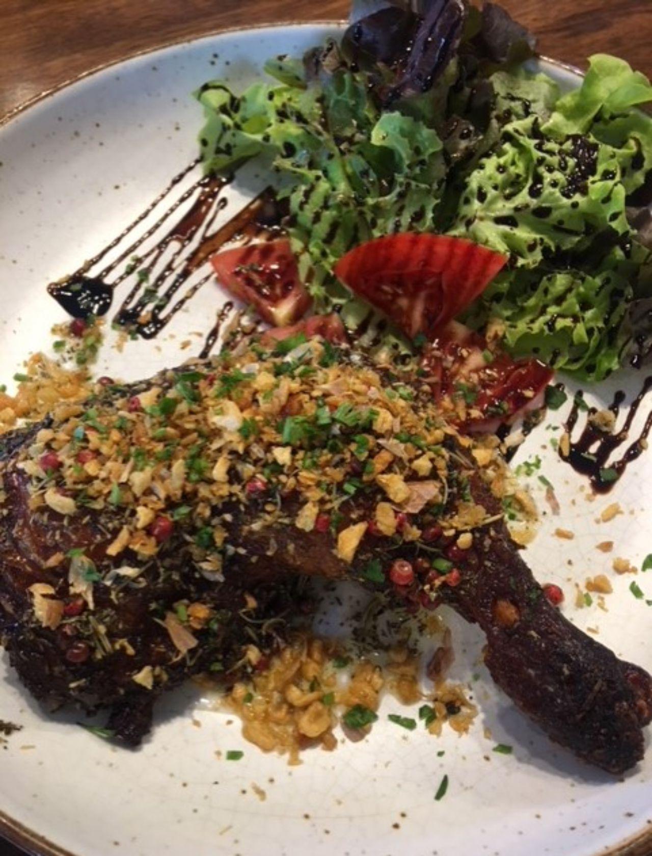 เป็นไก่สะโพกติดน่องหมักด้วยสมุนไพรหลากหลายชนิด กับโอลีฟออยล์เอ็กซ์ตร้าเวอร์จิน อบด้วยไฟต่ำ เพื่อให้เนื้อนุ่มหอมท็อปปิ้งด้วยน้ำมันมิกซ์เฮิร์ปพริกไทยแดง โอ๊ย...อันนี้เลิศเพราะอิมพอร์ตจากอิตาลี ที่สุดยังไม่พอ...มีกระเทียมกรอบโรยหน้า แล้วกินกับสลัดผักสดราดน้ำบัลซามิก เข้มข้นสุดไปเลยจ้า ถือเป็นจานเด็ดนะพูดเลย...เพราะมันกรอบอร่อยเว่อร์