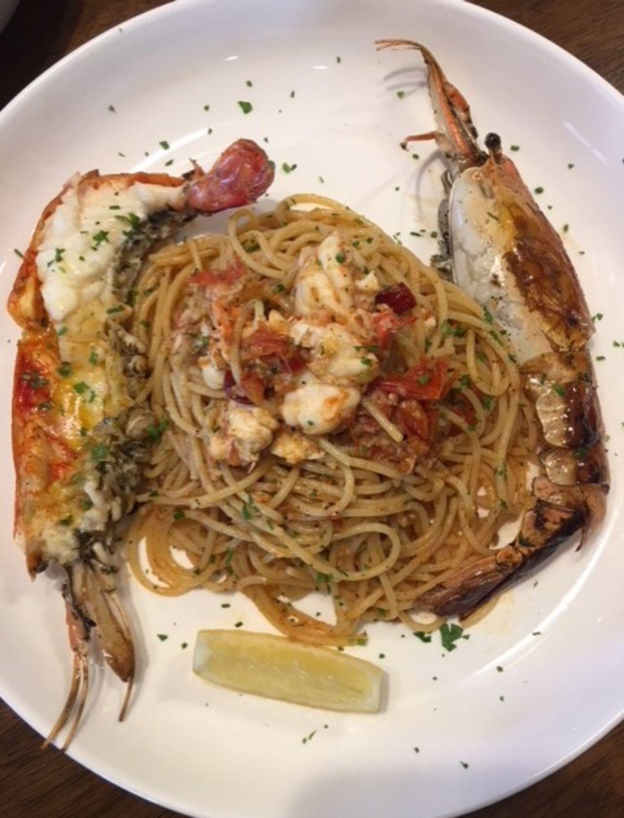 มาถึงจานนี้ ไฮไลต์ไม่ได้อยู่ที่เรื่องของเส้นสักเท่าไหร่ แต่รสชาติเส้น ก็มีความพริกแห้งหน่อยๆ ถูกปากคนไทยแน่ๆ โดยส่วนสำคัญอยู่ที่การย่างกุ้งแม่น้ำตัวใหญ่ๆ ให้หอมๆ อันนี้เราเลือกได้นะคะ เอากุ้งไปย่างครึ่งตัว ส่วนอีกครึ่งตัวก็ผัดกับซอสสูตรพิเศษที่หอบหิ้วมาจากอิตาลีมันเลิศค่ะคุณ โอ๊ย...เขียนไปน้ำลายสอ