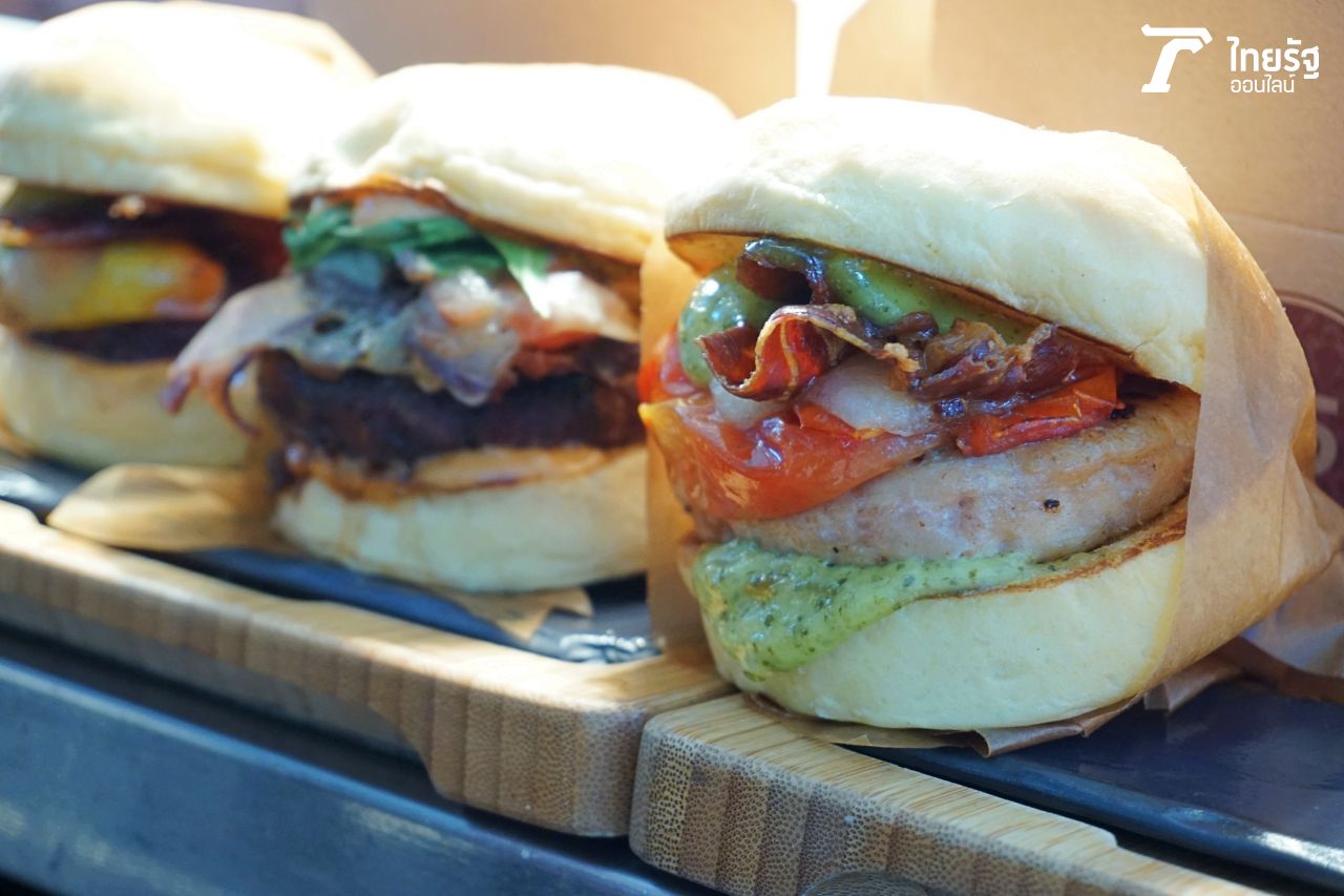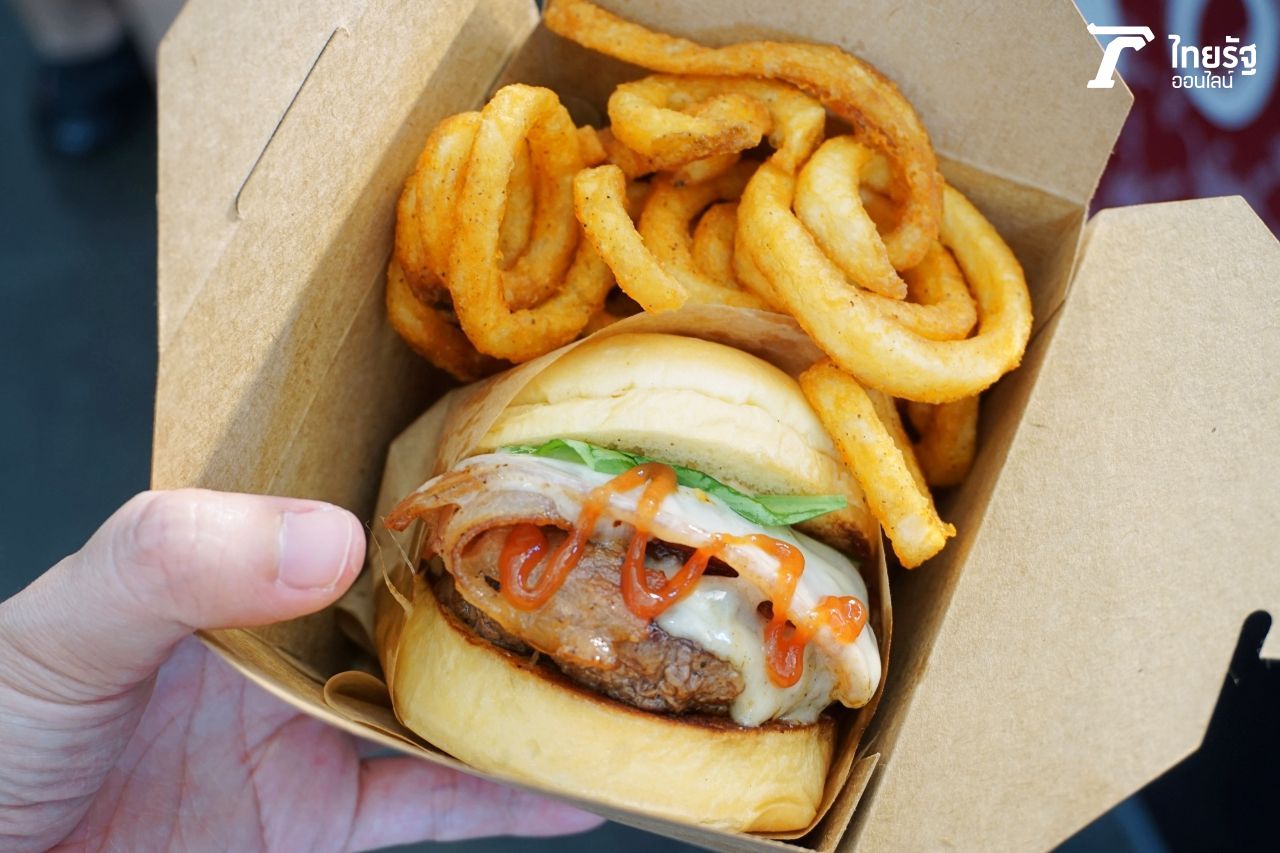 แต่วันนี้มาเปิดบูธเล็กๆ ก็เลยนำแค่เมนูเด็ดอย่างเบอร์เกอร์ มานำเสนอ 3 เมนู เราลองสั่งเมนู Burger Number One มาชิม ราคา 220 บาท เป็นเบอร์เกอร์เนื้อใส่ชีสเน้นๆ พร้อมด้วยเบคอน และซอสเทาส์ซันไอแลนด์