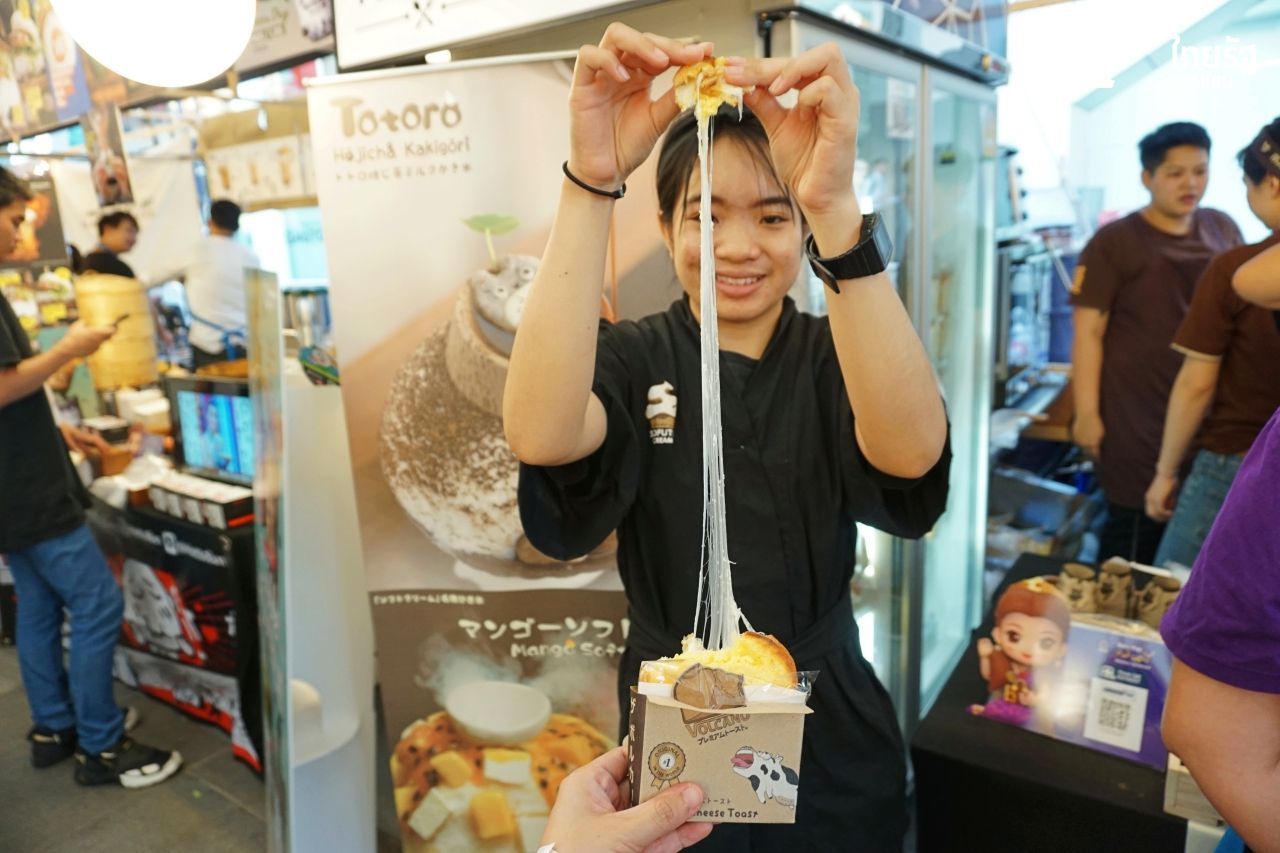 แถมถ้าอยากอร่อยก็ต้องบินไปกินถึงเชียงใหม่ มีถึง 5 สาขาด้วยกัน แต่วันนี้เป็นโชคดีของชาวกรุงเทพฯ จริงๆ ที่เขามาออกบูธในงาน เราไม่รอช้า ลองสั่งปังชีสยืด ราคา 85 บาทมาชิมซะหน่อย (สั่งแล้วรอขนมปังนาน 5 นาที เพราะทำสดใหม่ อบแผ่นต่อแผ่น)