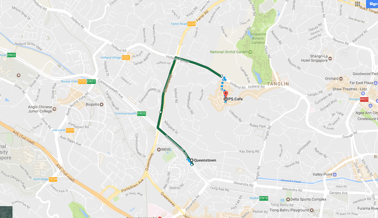 จากชางงีแอร์พอร์ต ให้คุณไปขึ้นรถไฟฟ้าสายสีเขียว นั่งไปลงที่สถานี Queenstown จ่ายผ่านบัตร EZ-Link จากนั้นต่อแท็กซี่อีก 7 นาที นั่งช่วงสั้นๆ ไปที่ร้านได้เลย ค่าแท็กซี่ไม่แพงมาก ประมาณ 5-10 SGD