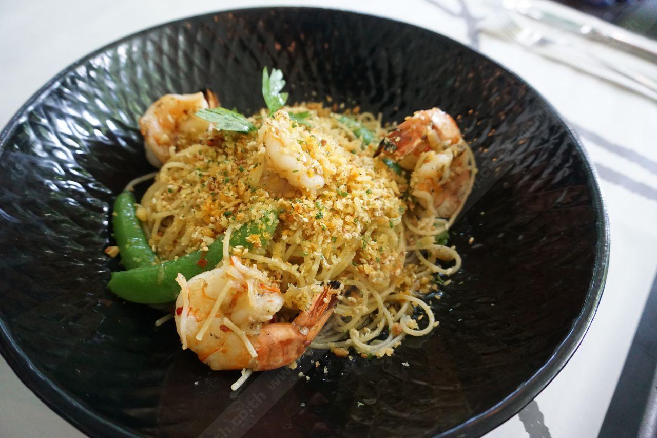 ปลื้มจานนี้เป็นพิเศษ กุ้งตัวใหญ่ สด กรอบ เนื้อหวาน เส้นสปาเก็ตตี้ปรุงมากำลังดี แต่ถ้าใครไม่ชอบเส้นแข็งแบบ Al Dente ก็บอกพนักงานเสิร์ฟว่าขอเส้นนิ่มๆ ได้ คลุกเคล้ามากับกระเทียมเจียวหอมกรอบ และถั่วลันเตาหวาน ปรุงรสกลางๆ ทานแล้วเข้ากันได้ดี จานใหญ่ อิ่มแน่นอน
