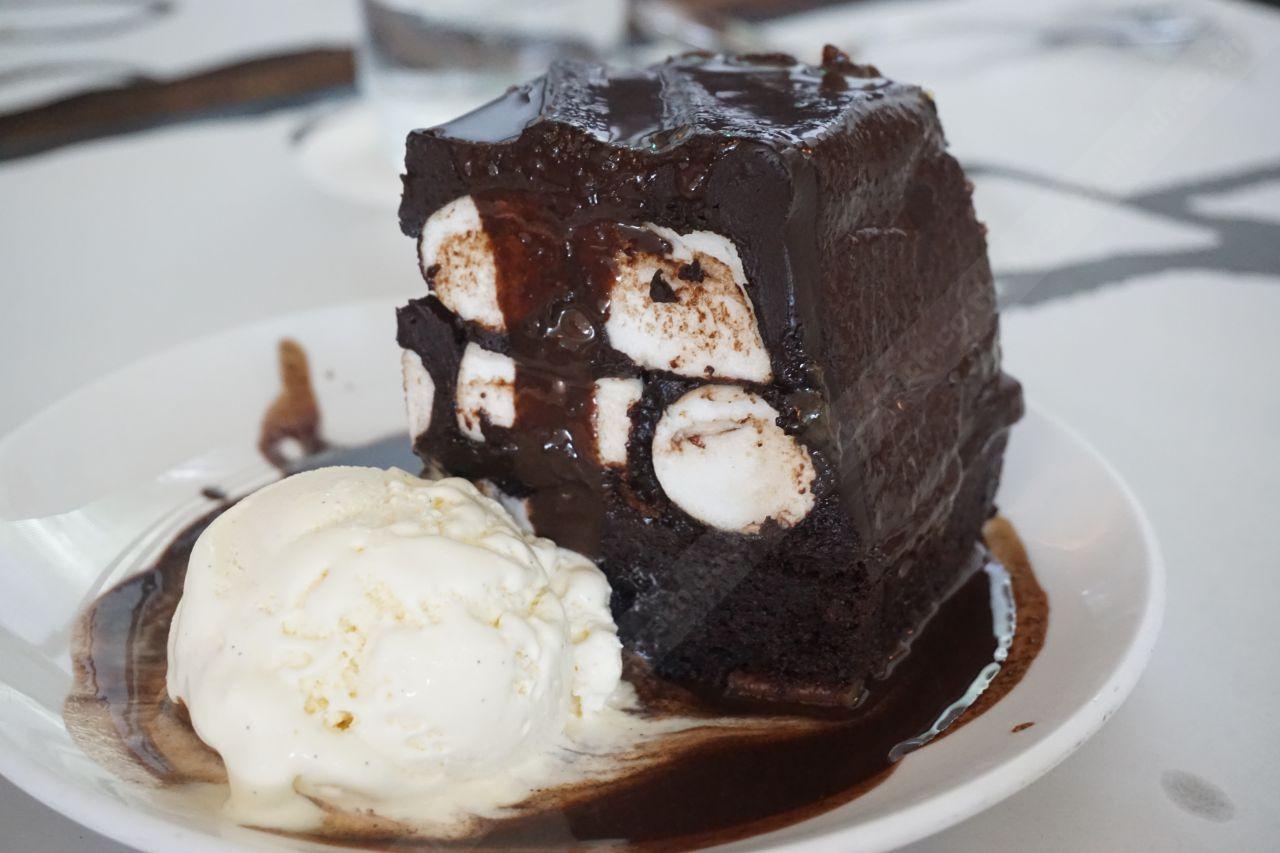 จานนี้สายของหวานต้องปลื้มปริ่ม เป็นเค้กหน้านิ่มช็อกโกแลตที่ได้รสช็อกโกแลตแท้เต็มๆ คำ แถมซอสไส้มาร์ชเมลโล่หยุ่นนิ่มๆ เข้ากันกับช็อกโกแลตไปอีก เสิร์ฟมาพร้อมกับไอศกรีมรสวานิลลา อืม...อาหย่อย