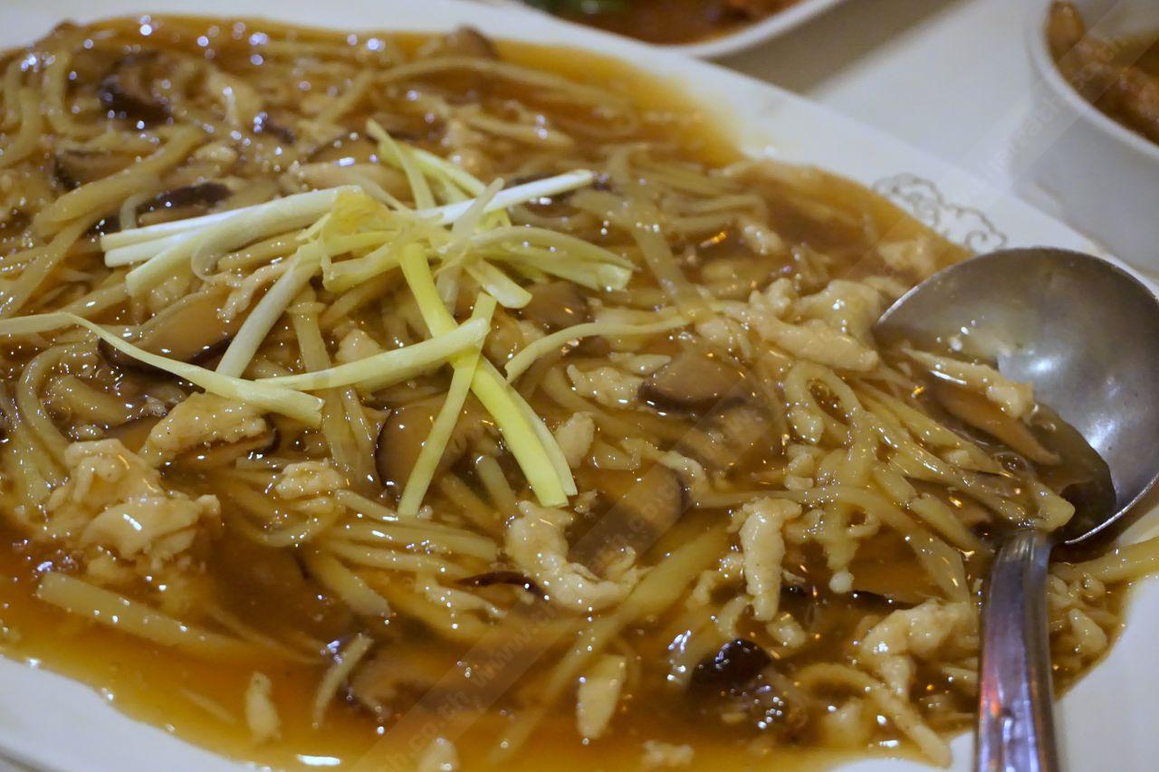 เป็นเส้นบะหมี่ทอด ราดหน้าด้วยน้ำราดหน้ารสชาติคล้ายๆ กระเพาะปลา มีเนื้อไก่ หน่อไม้ ถั่วงอก ปรุงมารสกลมกล่อม เสิร์ฟมาบนจานเปลขนาดใหญ่ เราว่าทานได้ประมาณ 3-4 คนเลย ราคาก็ตามขนาดจาน (ฮา...) แต่โดยรวมก็อร่อยอีกเช่นกันจ้า!