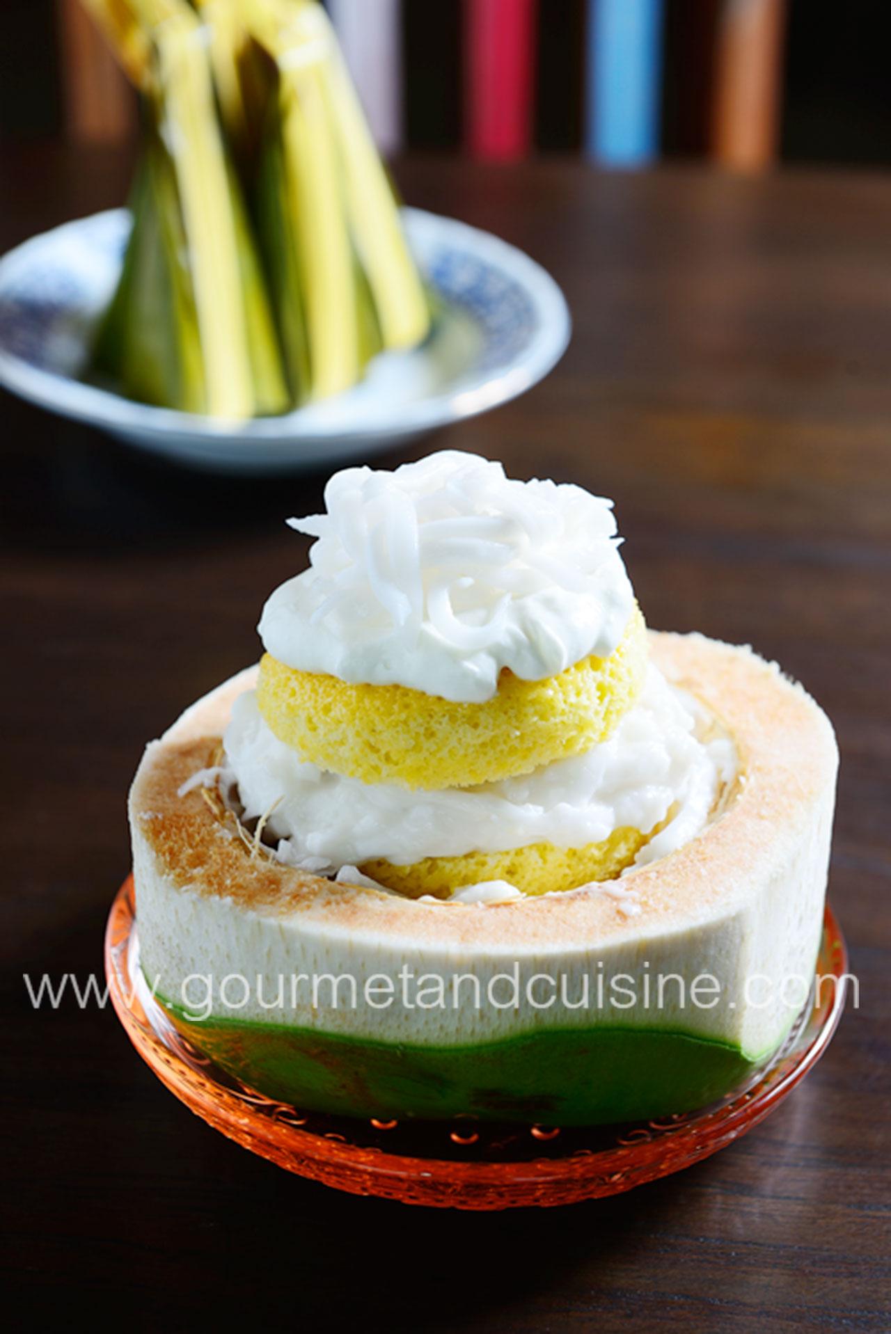 ปิดท้ายด้วยของหวาน เค้กมะพร้าว เค้กจากหุ้นส่วน เป็นเค้กฟองน้ำใบเตยใส่มะพร้าวอ่อนและครีมกะทิสลับชั้นกัน เสิร์ฟมาในผลมะพร้าว นุ่มและหวานหอมมะพร้าว