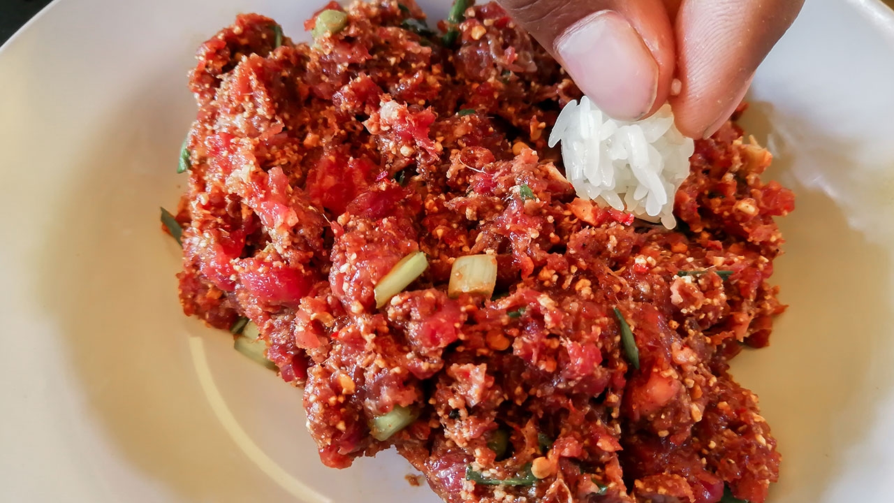 ที่มีเชื้อนี้ และเป็นเมนูที่ปรุงไม่สุก หรือเมนูปรุงแบบดิบ หรือสุกๆดิบๆ เช่น ลาบหลู้ จะทำให้ได้รับเชื้อ สเตร็ปโตค็อกคัส ซูอิส เข้าสู่ร่างกาย