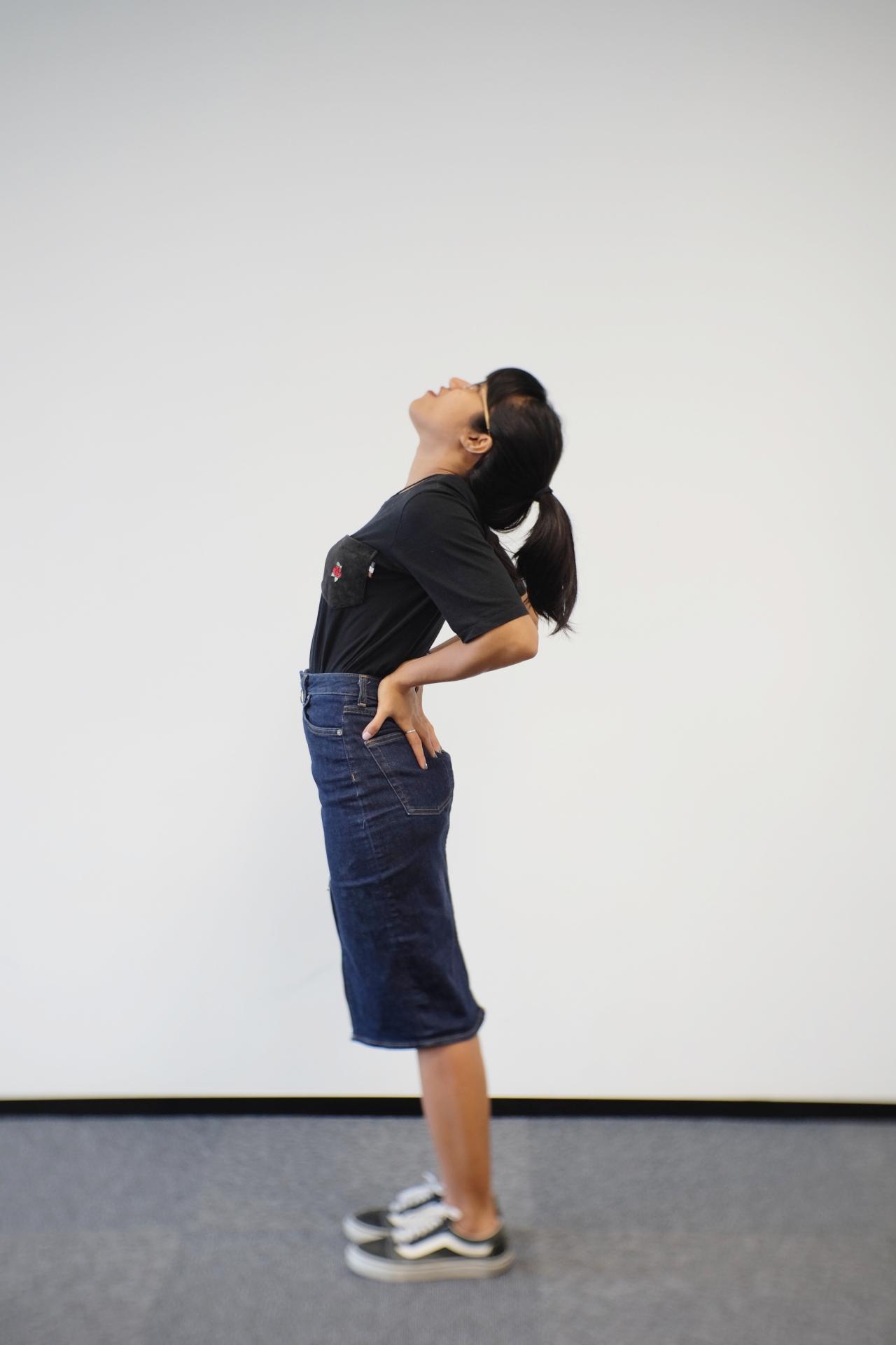 ก่อนอื่นเริ่มจากยืนตัวตรง กางขาออกเล็กน้อยประมาณช่วงไหล่ จากนั้นเอามือจับที่เอว แล้วเอนตัวไปด้านหลัง ค้างไว้ 15 วินาที แล้วคลายออกกลับมายืนตัวตรง ทำ 3 รอบ