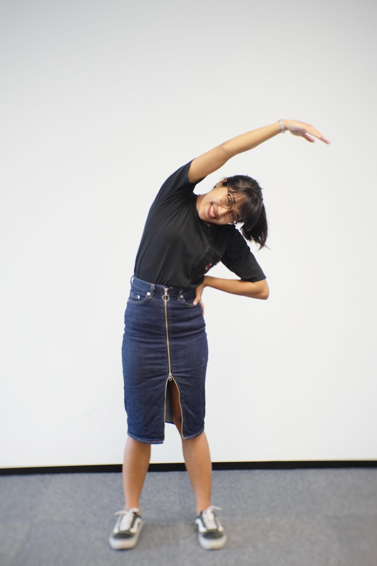 ยืนตัวตรง จากนั้นยกมือขึ้นสุดแขน 1 ข้าง แล้วเอียงตัวให้สุดจนรู้สึกตึง ค้างไว้ 15 นาที แล้วคลาย จากนั้นค่อยเปลี่ยนข้าง ทำสลับกันข้างละ 3 รอบ