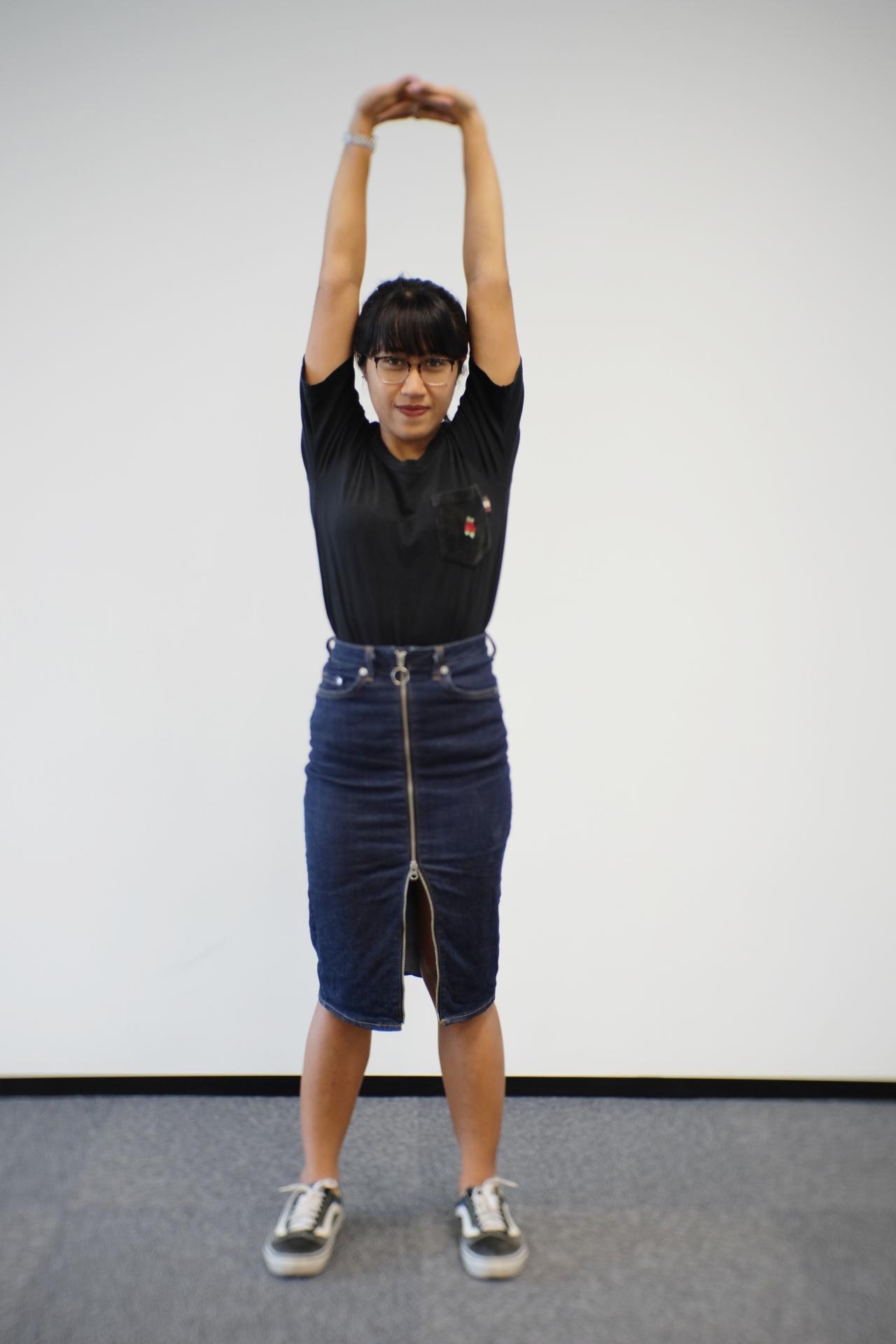 ลุกขึ้นมายืนตัวตรง จากนั้นยกแขนทั้ง 2 ข้างขึ้นเหนือศีรษะ ประสานมือไว้ด้วยกันด้านบนแล้วเอนศีรษะมาด้านหน้า จนรู้สึกตึงที่คอ ไหล่ ค้างไว้ 15 วินาทีค่อยคลาย ทำประมาณ 3 รอบ