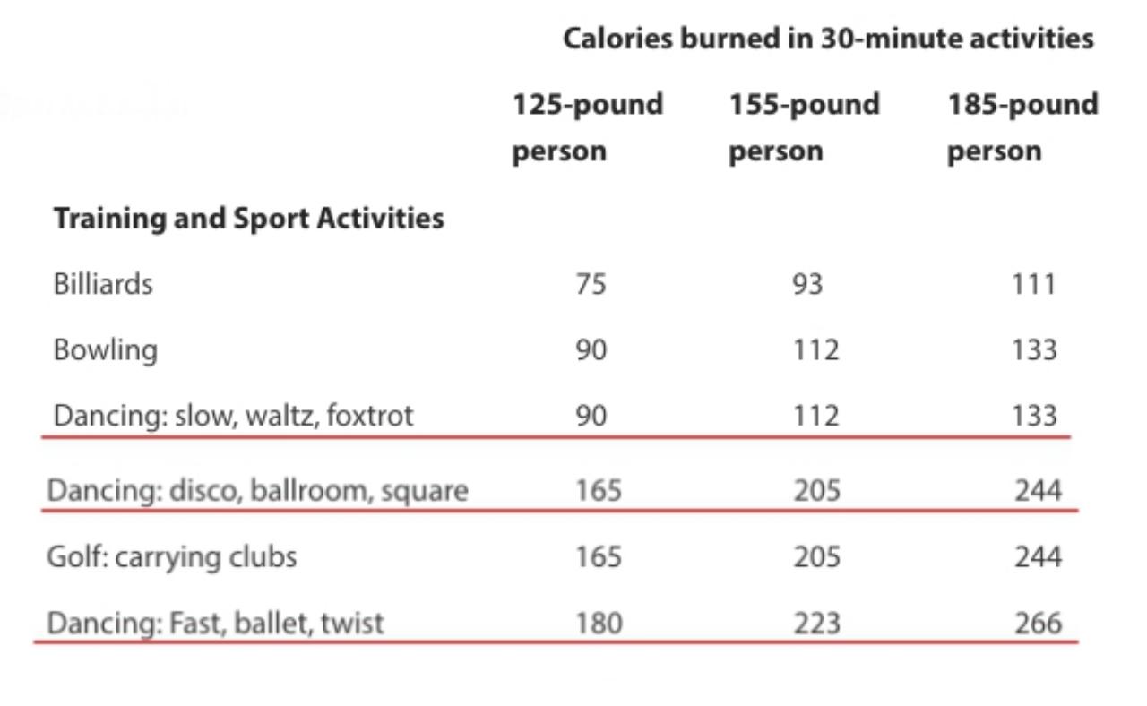หนึ่งในกิจกรรมที่มีข้อมูลน่าสนใจก็คือ "การเต้น" ซึ่งสามารถช่วยให้คุณเบิร์นไขมันส่วนเกินได้ตั้งแต่ 90-266 แคลอรีเลยทีเดียว แบ่งเป็นการเต้นแบบเบา แบบกลาง และแบบสนุกสุดเหวี่ยง ซึ่งอย่างหลังก็จะเผาผลาญได้มากกว่าสองอย่างแรก
