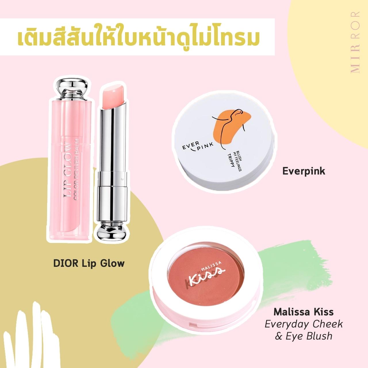 สุดท้ายนอกเหนือจากการดูแลตัวเองตามทิปส์ทั้ง 4 ข้อด้านบนแล้ว MIRROR อยากลองให้คุณลองแต่งแต้มสีสันเข้าไปบนใบหน้าของคุณด้วยเช่นกันนะคะ ไม่ว่าจะเป็นแก้มสีส้มเม็ดคล้ายเลือดฟาด หรือปากสีชมพูระเรื่อ เพราะไอเทมพวกนี้จะช่วยให้คุณดูสุขภาพดียิ่งขึ้น ในช่วงระหว่างรอการฟื้นฟูผิวค่ะ
