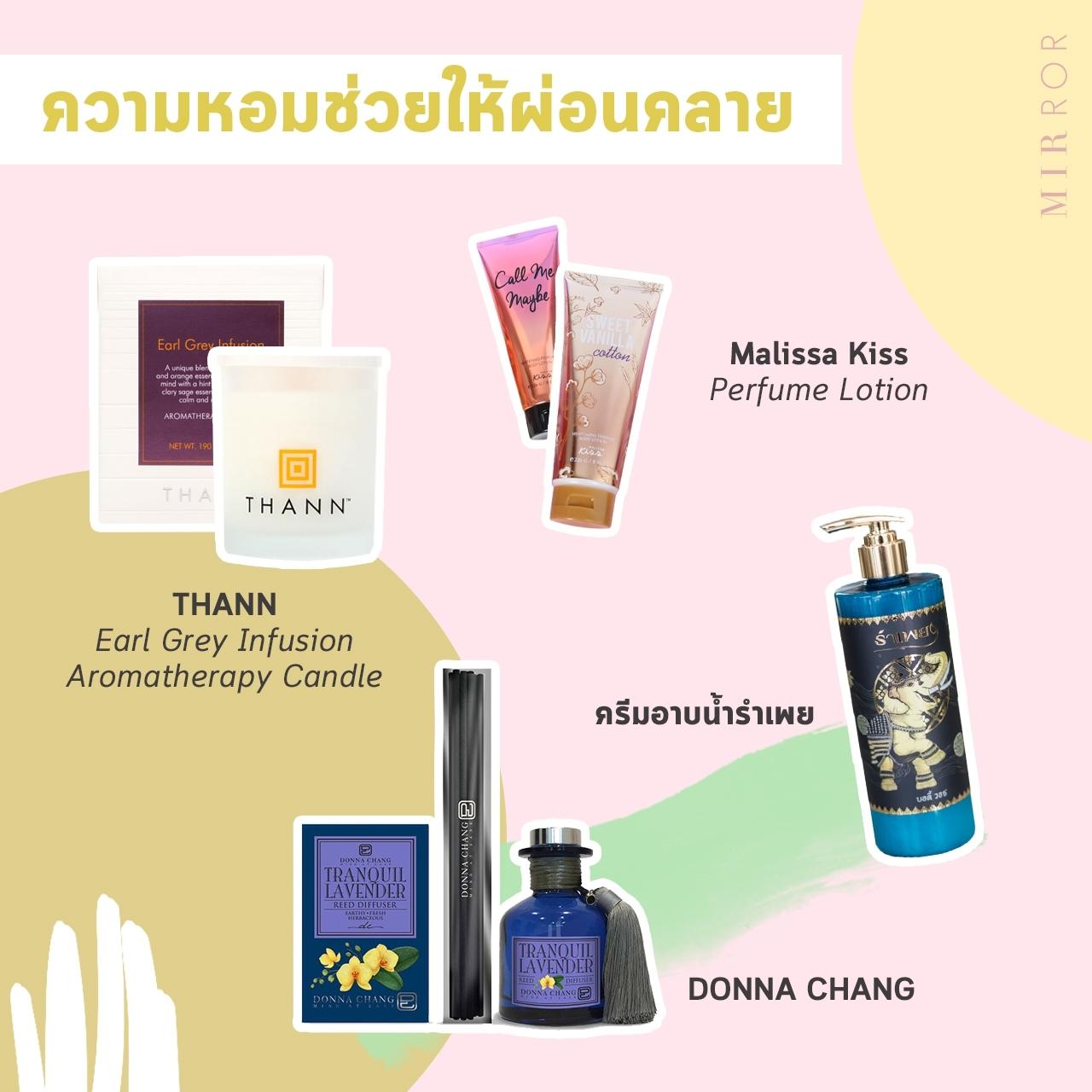 ครีมทาผิวกลิ่นหอม : หากบ้านใครไม่มีเทียนอะโรม่า การได้ใช้โลชั่นน้ำหอม Malissa Kiss Perfume Lotion ก็ถือว่าช่วยเพิ่มบรรยากาศและสุนทรีย์ในการ Work from home ให้กับตัวเองได้ดีไม่ต่างจากการจุดเทียนเลยค่ะ