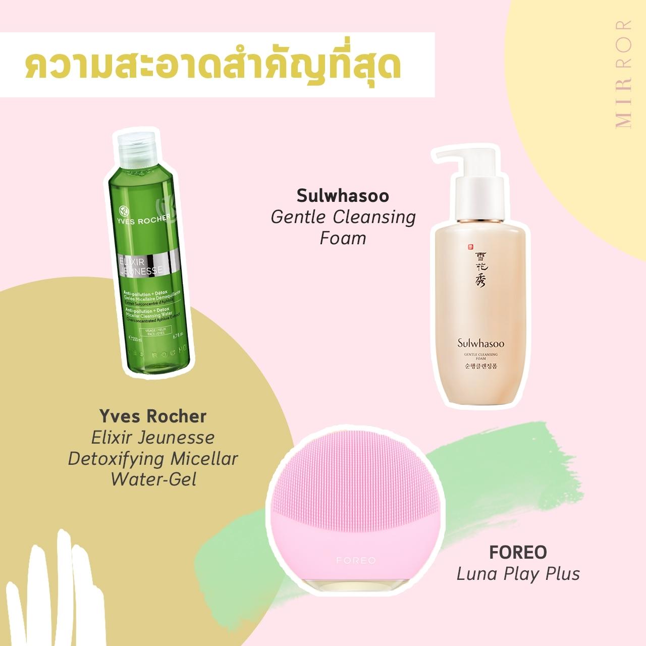 หลายๆ ครั้งที่ตัวเราเกิดปัญหาผิว ไม่ว่าจะเป็นในเรื่องของสิว ริ้วรอย หรือแม้กระทั่งผื่นแพ้ MIRROR ต้องถามทุกๆ คนก่อนนะคะ ว่าคุณได้ใส่ใจในเรื่องของความสะอาดแล้วหรือยัง จริงอยู่ที่การอยู่บ้านคุณอาจจะไม่ได้แต่งหน้าเหมือนวันไปทำงาน แต่มลพิษ ฝุ่น หมอกควันหรือสิ่งสกปรกต่างๆ ที่เกิดขึ้นจากมลภาวะที่เราไม่สามารถมองเห็นได้ด้วยตาเปล่า ก็เป็นอีกหนึ่งปัจจัยที่ทำร้ายผิวหน้าของเราเช่นกัน MIRROR จึงต้องยกเรื่องความสะอาดมาเป็นอันดับแรก และถือเป็นสิ่งที่คุณละเลยไปไม่ได้ แม้วันนั้นจะไม่ได้แต่งหน้าก็ตาม