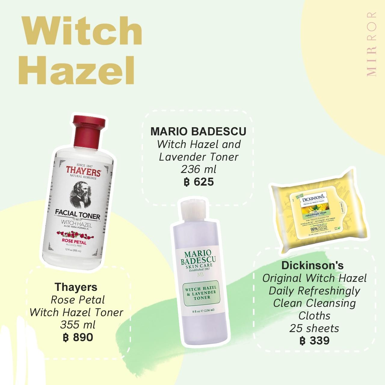 "วิชฮาเซล" เป็นพืชจากอเมริกาเหนือ ลักษณะเป็นไม้พุ่มขนาดเล็ก มีประโยชน์ทางด้านการแพทย์และทางด้านความงามหลากหลายประการ แต่ MIRROR อยากจะให้โฟกัสที่ทีเด็ดของเจ้า "วิชฮาเซล" ทางด้านการรักษาสิว เพราะมันมีสารต้านการอักเสบและสารต่อต้านอนุมูลอิสระที่สามารถช่วยลดรอยแดงและการระคายเคืองของผิว ช่วยปลอบประโลมผิวที่ถูกทำลายให้คืนสภาพเดิมได้เร็วขึ้น ทั้งยังช่วยลดแบคทีเรียและการติดเชื้อต่างๆ ได้อีกด้วย (อ่านเพิ่มเติมเกี่ยวกับวิชฮาเซล)