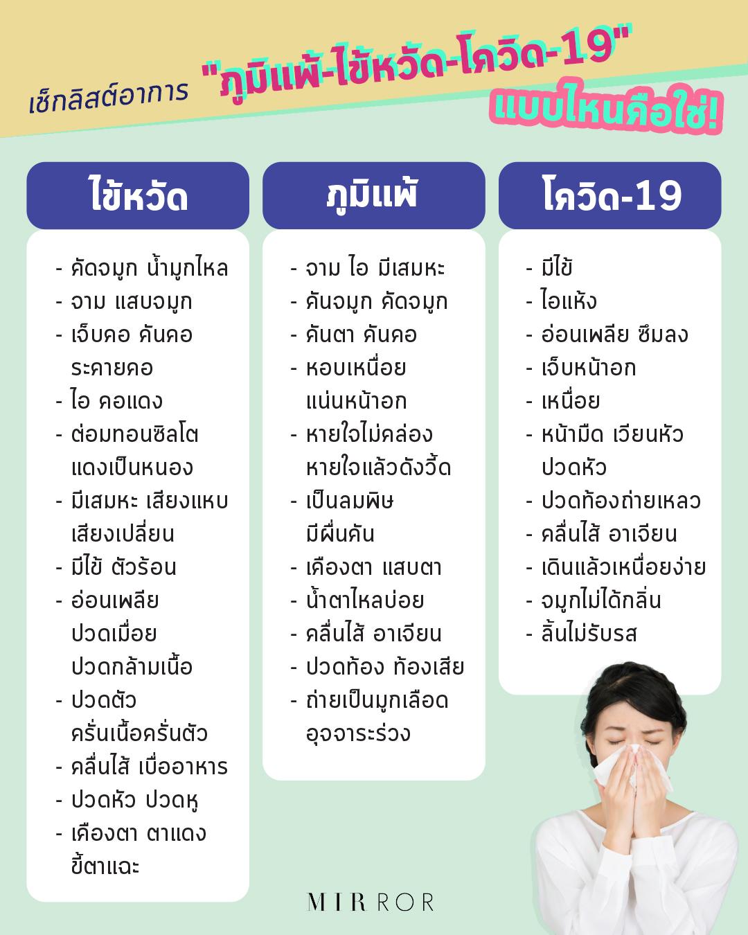Panic กันแน่ๆ ช่วงที่อากาศเย็นๆ แบบนี้ หลายคนเริ่มมีน้ำมูกไหล ไอ และเจ็บคอตามมา จนรู้สึกกังวลว่า...อาการที่เป็น คืออาการของโรคอะไรกันแน่ ระหว่าง "ภูมิแพ้ ไข้หวัด โควิด-19" วันนี้ MIRROR จึงมาอัปเดตอาการของแต่ละโรคให้สาวๆ ได้เช็กลิสต์กัน เพราะเชื่อว่าหลายคนอาจจะเครียดและวิตกกังวลไปกันใหญ่ มาดูกันชัดๆ กันค่ะ...ว่าแต่ละโรคมีอาการอย่างไร? ที่สำคัญบางอาการ 3 โรคที่กล่าวมาข้างต้น อาจเหมือนกันเสียเหลือเกิน ทั้งนี้ไม่ต้องกังวลไปนะคะ แนะนำให้เราต้องดูอาการอื่นๆ ควบคู่กันไปด้วย แต่อย่างไรก็ตามเห็นท่าไม่ดี อาการหนักขึ้น แนะนำให้รีบไปพบแพทย์ทันที เพื่อความสบายของเราและคนในครอบครัวด้วยนะ