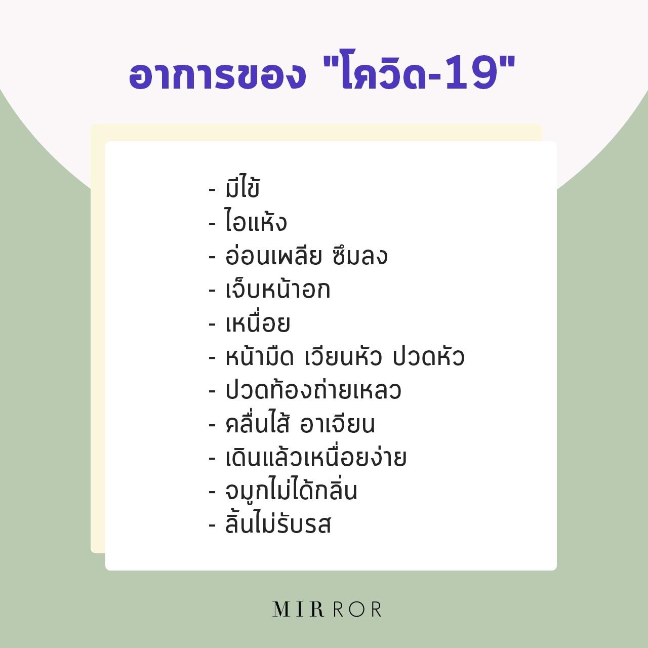 กรมควบคุมโรค กระทรวงสาธารณสุข ระบุไว้ว่า เชื้อไวรัสโคโรนาหรือ "โควิด-19" จะส่งผลต่อผู้คนในรูปแบบที่แตกต่างกันไป ผู้ที่ติดเชื้อส่วนใหญ่จะมีอาการเล็กน้อยถึงปานกลาง โดยพบอาการทั่วไปดังนี้