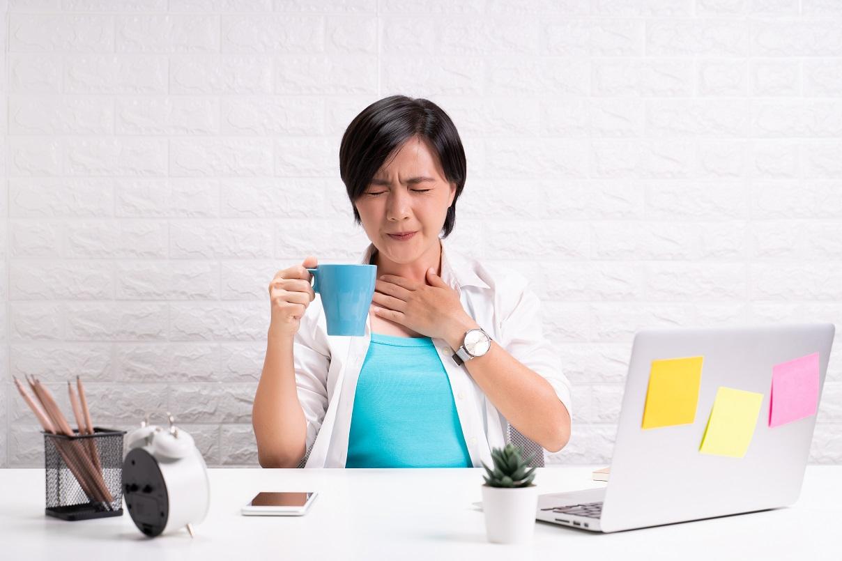 - กลืนลำบาก หรือรู้สึกเจ็บขณะกลืน