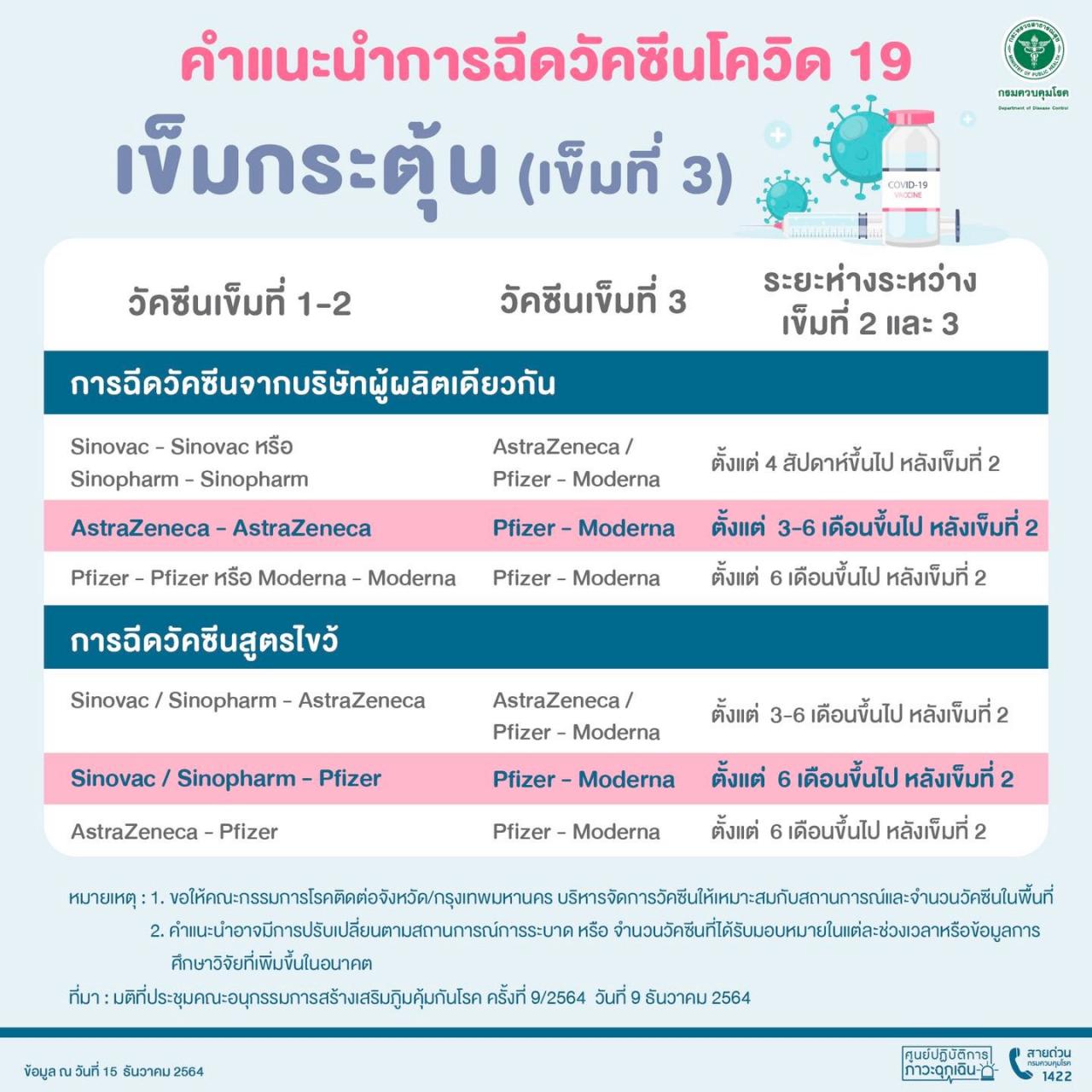 ฉีดวัคซีนเข็มที่ 3 ได้ด้วย AstraZeneca หรือ Pfizer - Moderna ตั้งแต่ 3 - 6 สัปดาห์ขึ้นไปหลังฉีดเข็ม 2