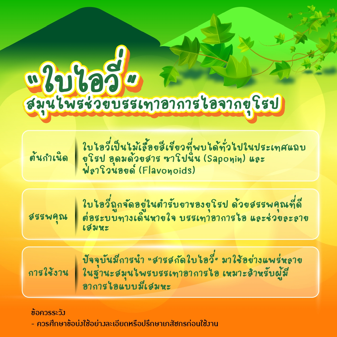 สมุนไพรคือหนึ่งในทางเลือกบรรเทาอาการไอจากธรรมชาติที่มีการส่งต่อภูมิปัญญากันมาอย่างยาวนาน ซึ่งหากพูดถึงสมุนไพรแก้ไอแล้ว "ใบไอวี่" ไม้เลื้อยสีเขียวที่มีต้นกำเนิดในแผ่นดินยุโรป คือผลผลิตจากธรรมชาติที่ได้รับการยอมรับอย่างกว้างขวางและยังถูกจัดอยู่ในตำรับยาระดับสากลจนได้รับความไว้วางใจและใช้งานกันมาอย่างยาวนาน โดยในใบไอวี่นั้นอุดมไปด้วยสาร "ซาโปนิน" (Saponin) และ "ฟลาโวนอยด์" (Flavonoids) ที่มีสรรพคุณที่ดีต่อระบบทางเดินหายใจ และยังมีส่วนช่วยลดอาการไอด้วยการขับเสมหะและละลายเสมหะ ทำให้คอโล่ง ไม่ระคายเคือง ซึ่งประสิทธิภาพดังกล่าวได้มีการศึกษาโดยหน่วยงานชั้นนำของยุโรป
