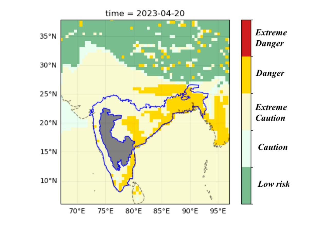 ภาพที่ 2 : แผนที่จำแนกอุณหภูมิกับระดับความร้อนที่กระทบต่อการดำรงชีวิต พบว่าหลายพื้นที่ของอินเดียอยู่ในระดับอันตราย